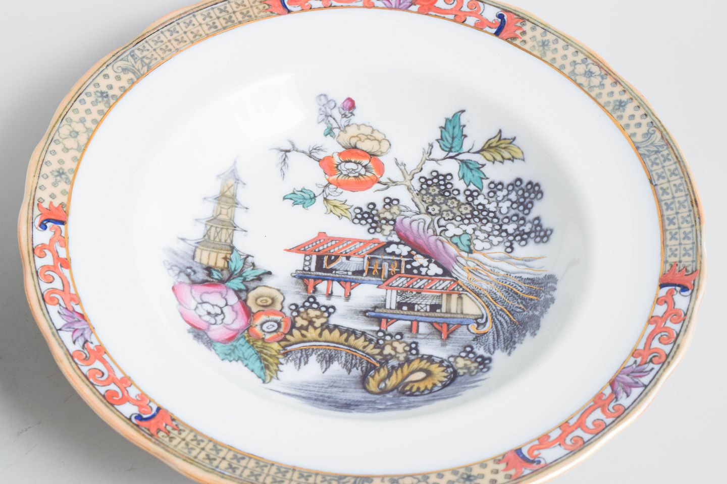 Dybe tallerkener i fajance med orientalsk inspireret dekoration i polykrome farver og detaljerig bemaling i japansk stil, karakteristisk for Rörstrands japanismeproduktion fra begyndelsen af 1900-tallet.