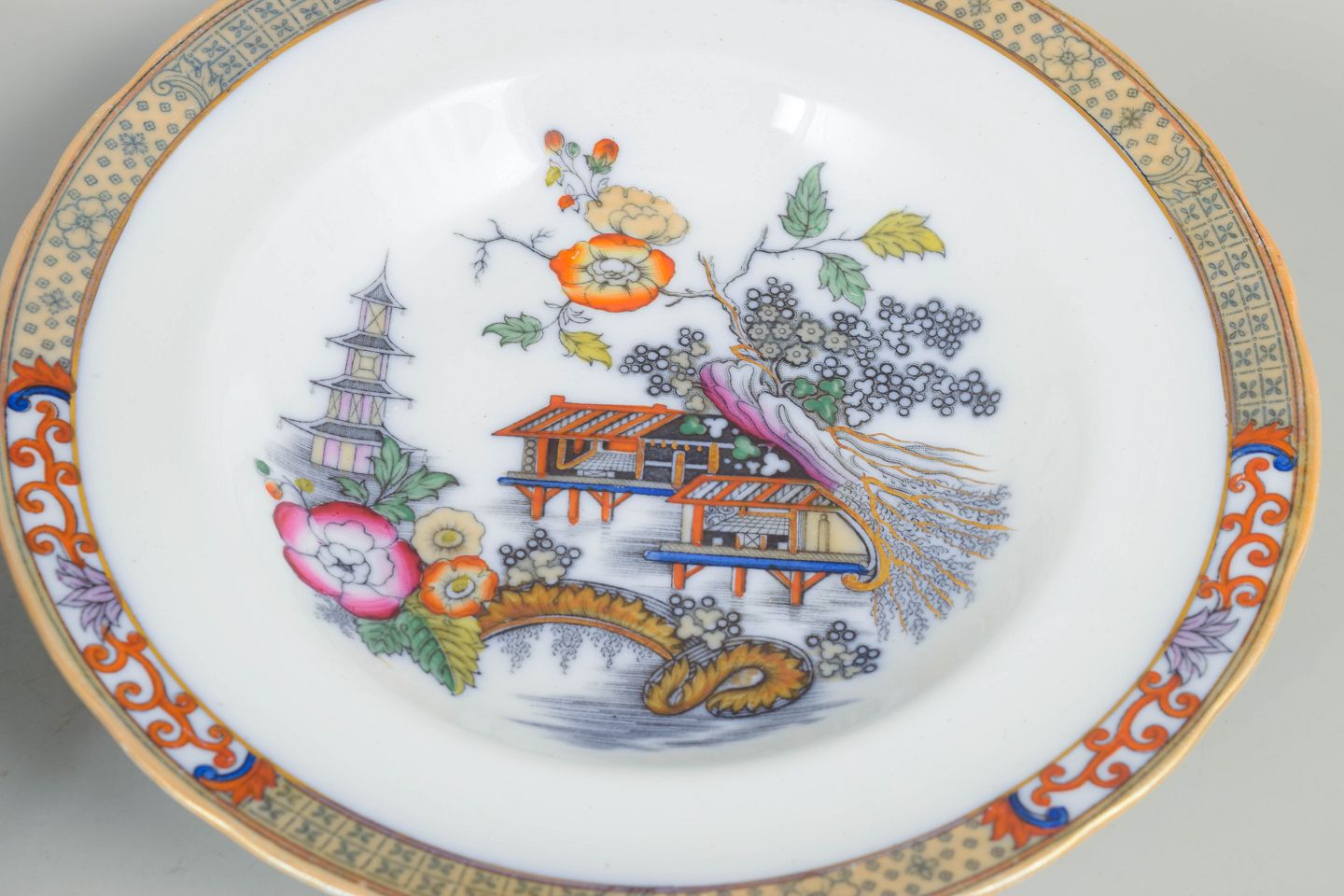 Dybe tallerkener i fajance med orientalsk inspireret dekoration i polykrome farver og detaljerig bemaling i japansk stil, karakteristisk for Rörstrands japanismeproduktion fra begyndelsen af 1900-tallet.