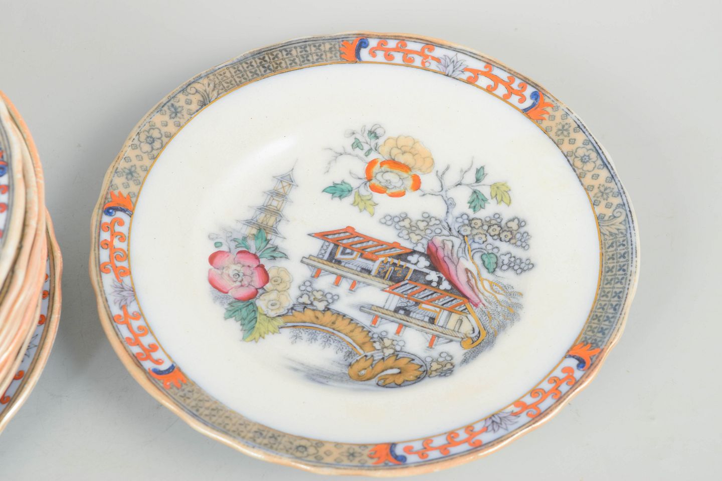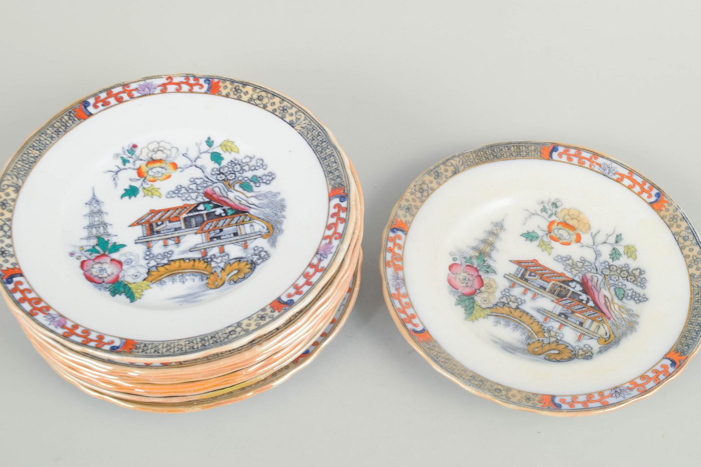 Flade tallerkener i fajance med orientalsk inspireret dekoration i polykrome farver og detaljerig bemaling i japansk stil, karakteristisk for Rörstrands japanismeproduktion fra begyndelsen af 1900-tallet.