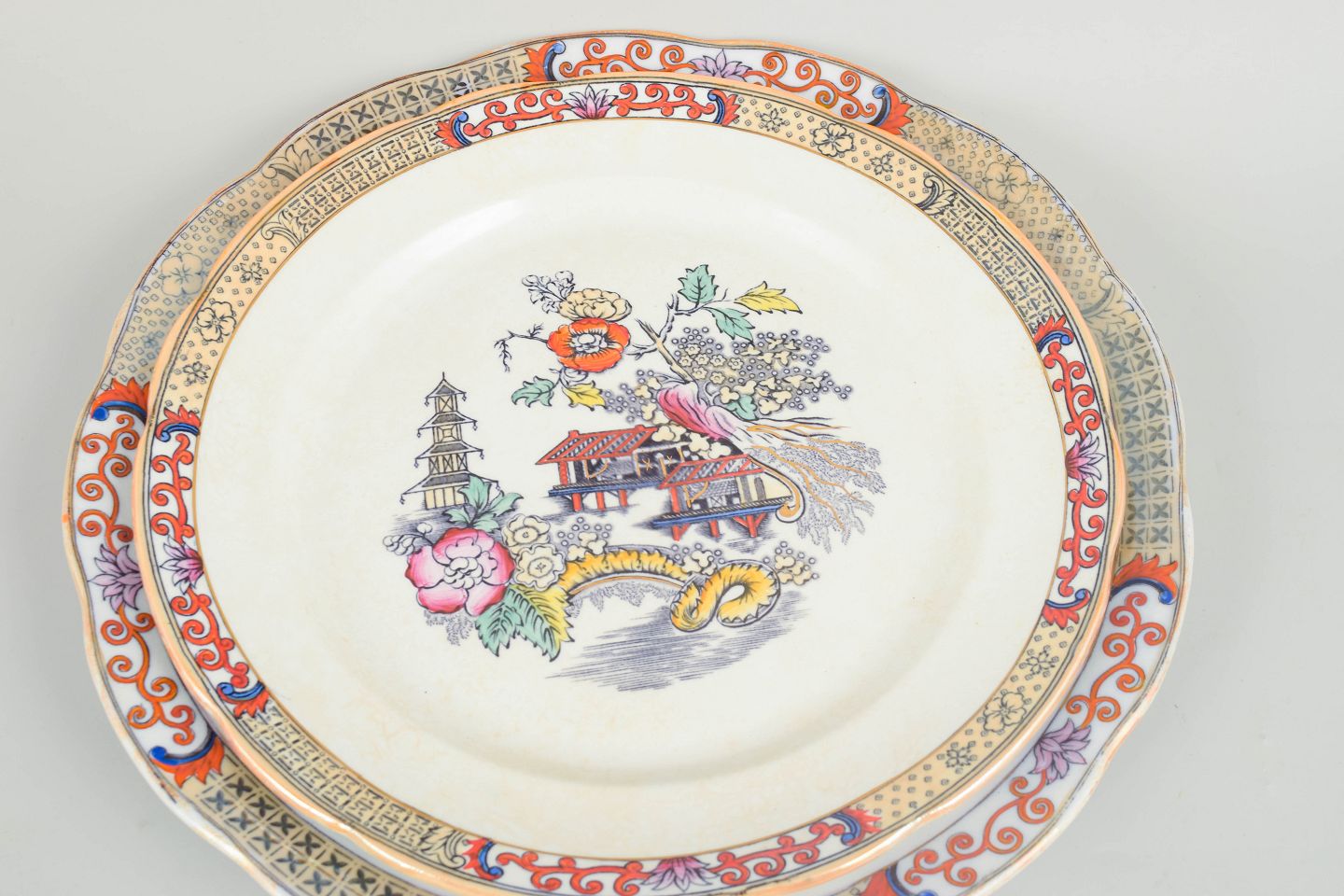 Store runde serveringsfade i fajance med orientalsk inspireret dekoration i polykrome farver og detaljerig bemaling i japansk stil, karakteristisk for Rörstrands japanismeproduktion fra begyndelsen af 1900-tallet.