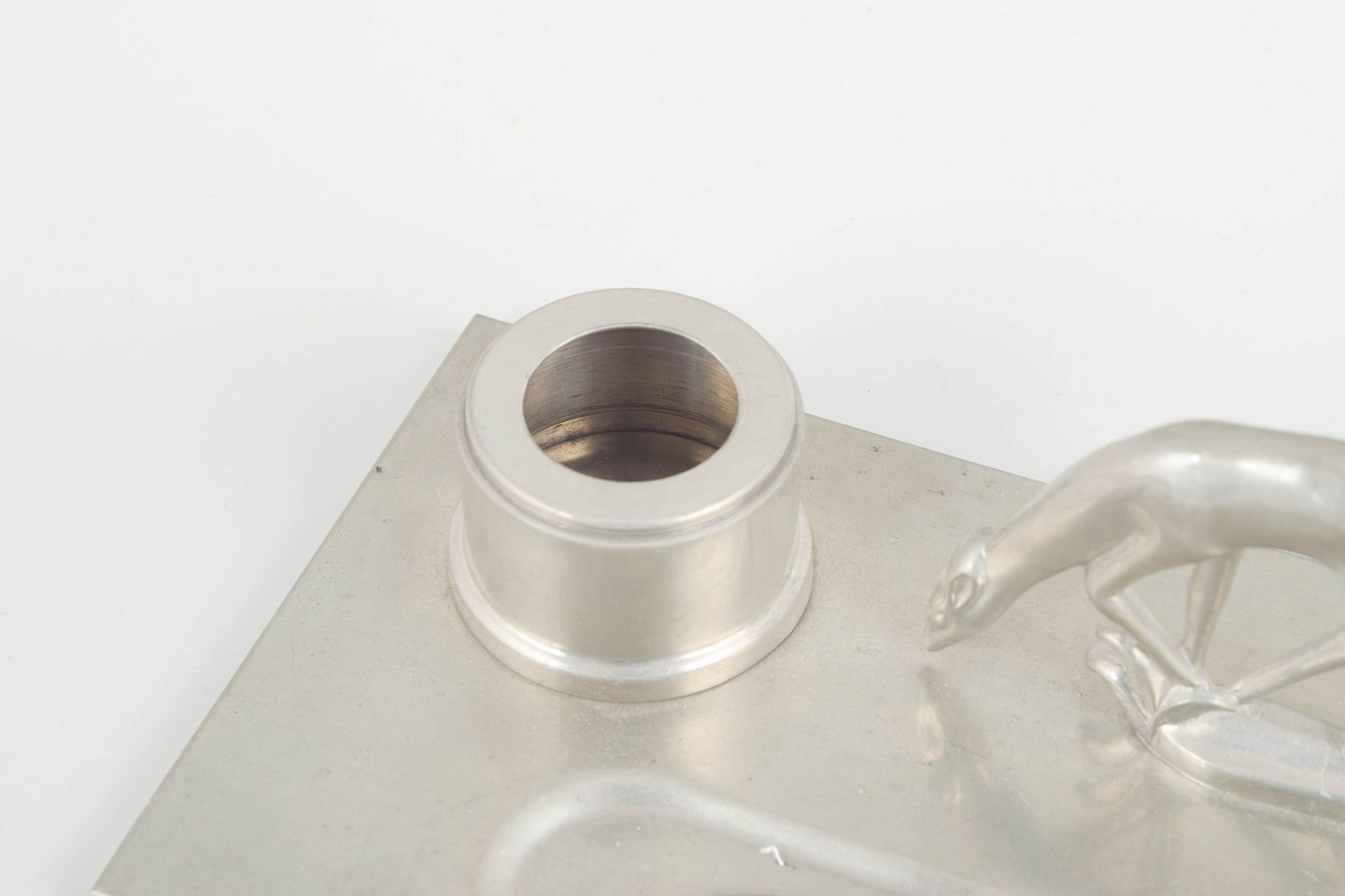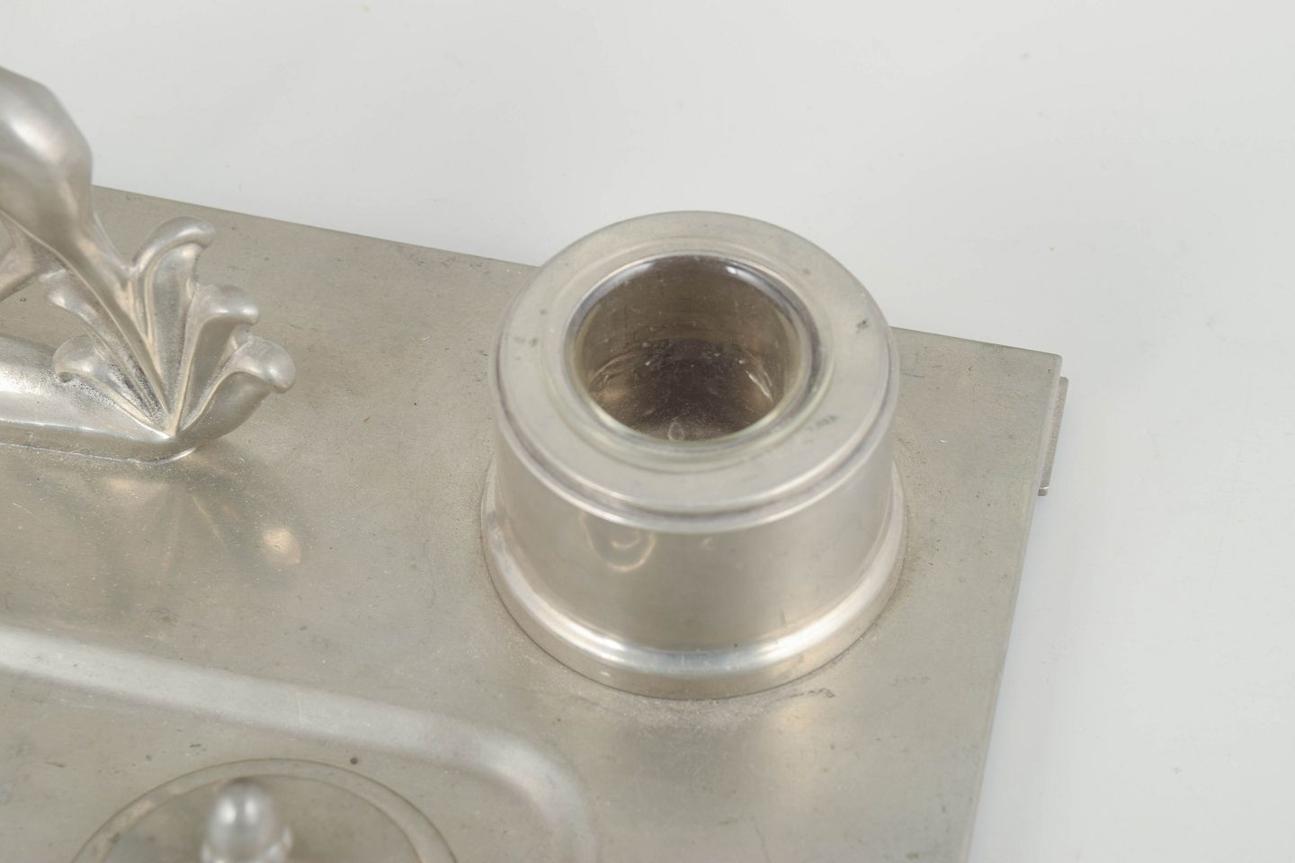 Rektangulært blækhus i tin med to beholdere og dekorativ hjortefigur i midten. Den ene glasindsats mangler. Stemplet under bunden.