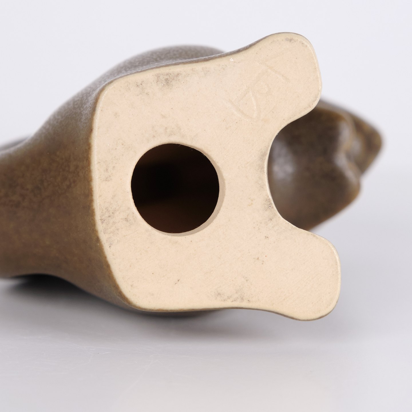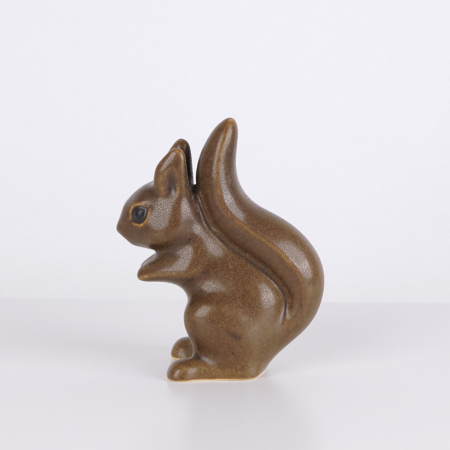 Hasenfigur von Knud Basse aus braun glasierter Keramik. Das Modell zeigt einen aufrecht sitzenden Hasen mit zusammengelegten Vorderpfoten und markanter Schwanzform auf der Rückseite. Die Figur ist vorne mit einem hellen Detail dekoriert und ein klassisches Beispiel für Knud Basses beliebte Tierfiguren aus den 1960er Jahren.
