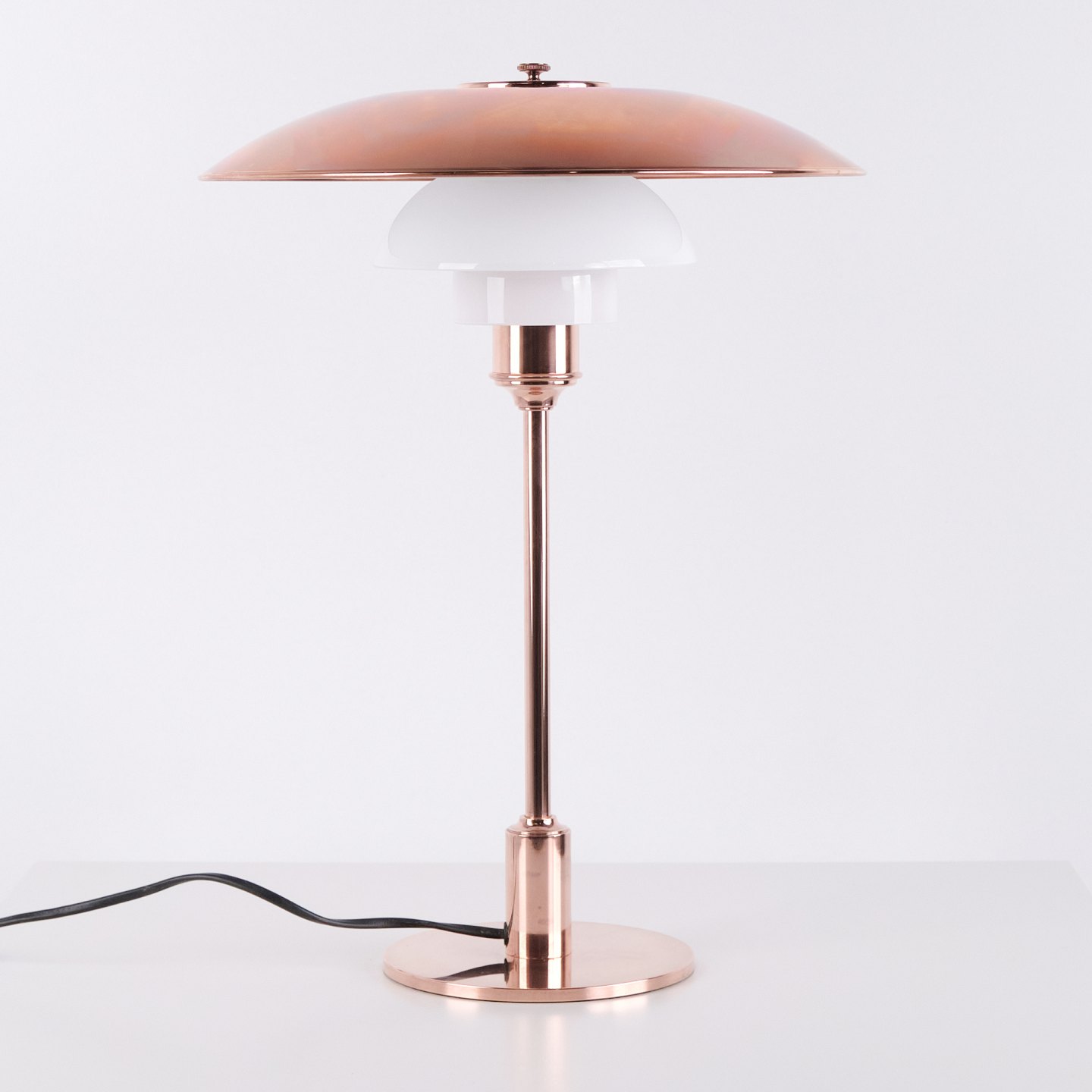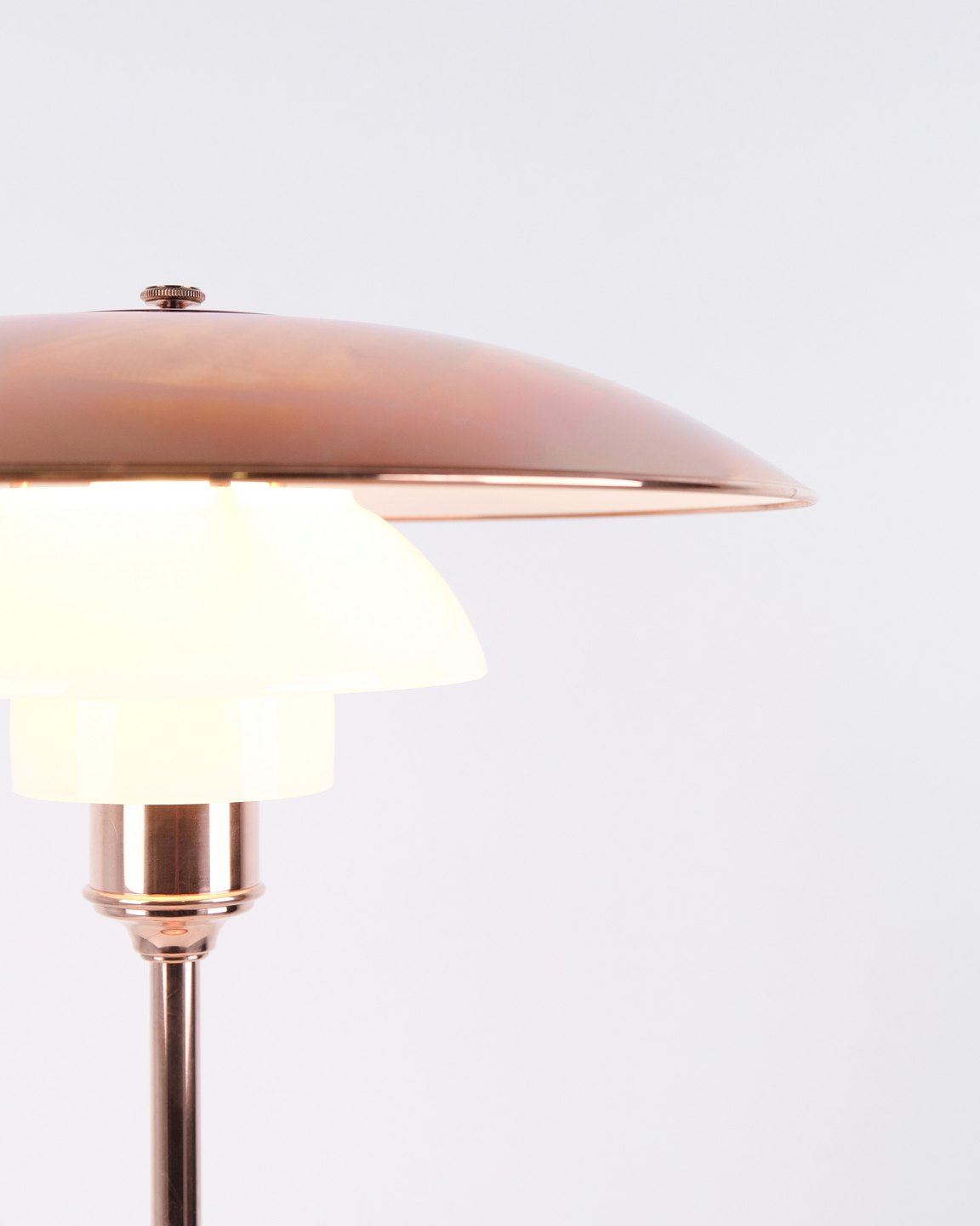 PH Tischlampe Modell PH 3½-2½ Limited Edition, entworfen von Poul Henningsen und hergestellt von Louis Poulsen. Die Lampe ist aus Kupfer gefertigt, mit oberem Schirm aus Kupfer sowie zwei unteren Schirmen aus weißem Opalglas. Bei dieser Ausführung ist nur der obere Kupferschirm enthalten. Das Modell wurde nur für einen begrenzten Zeitraum im Jahr 2015 produziert und verkauft und ist daher besonders begehrt bei Sammlern von PH Lampen und dänischem Lichtdesign.