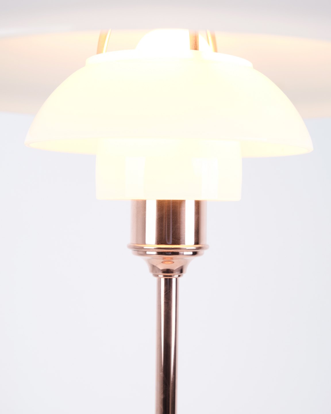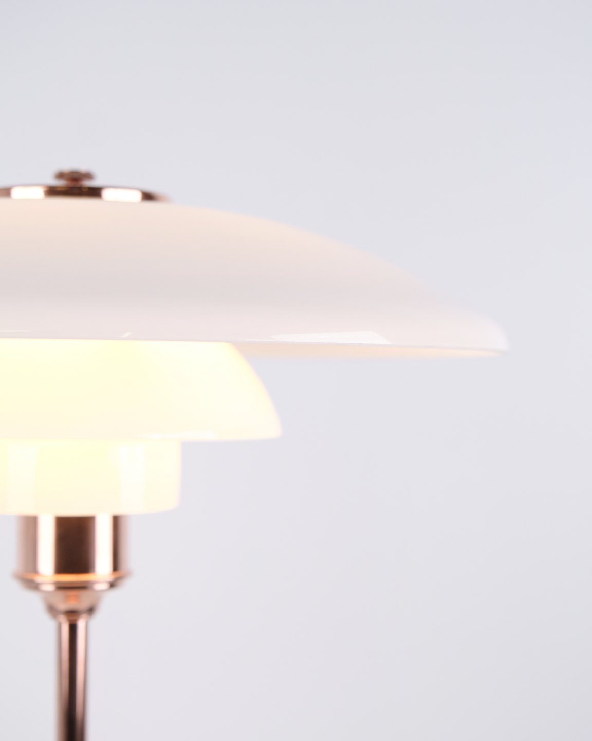 PH Tischlampe Modell PH 3½-2½ Limited Edition, entworfen von Poul Henningsen und hergestellt von Louis Poulsen. Die Lampe ist aus Kupfer gefertigt mit oberem Schirm aus weißem Opalglas sowie zwei unteren Schirmen aus weißem Opalglas. Das Modell wurde im Jahr 2015 nur für einen begrenzten Zeitraum verkauft.