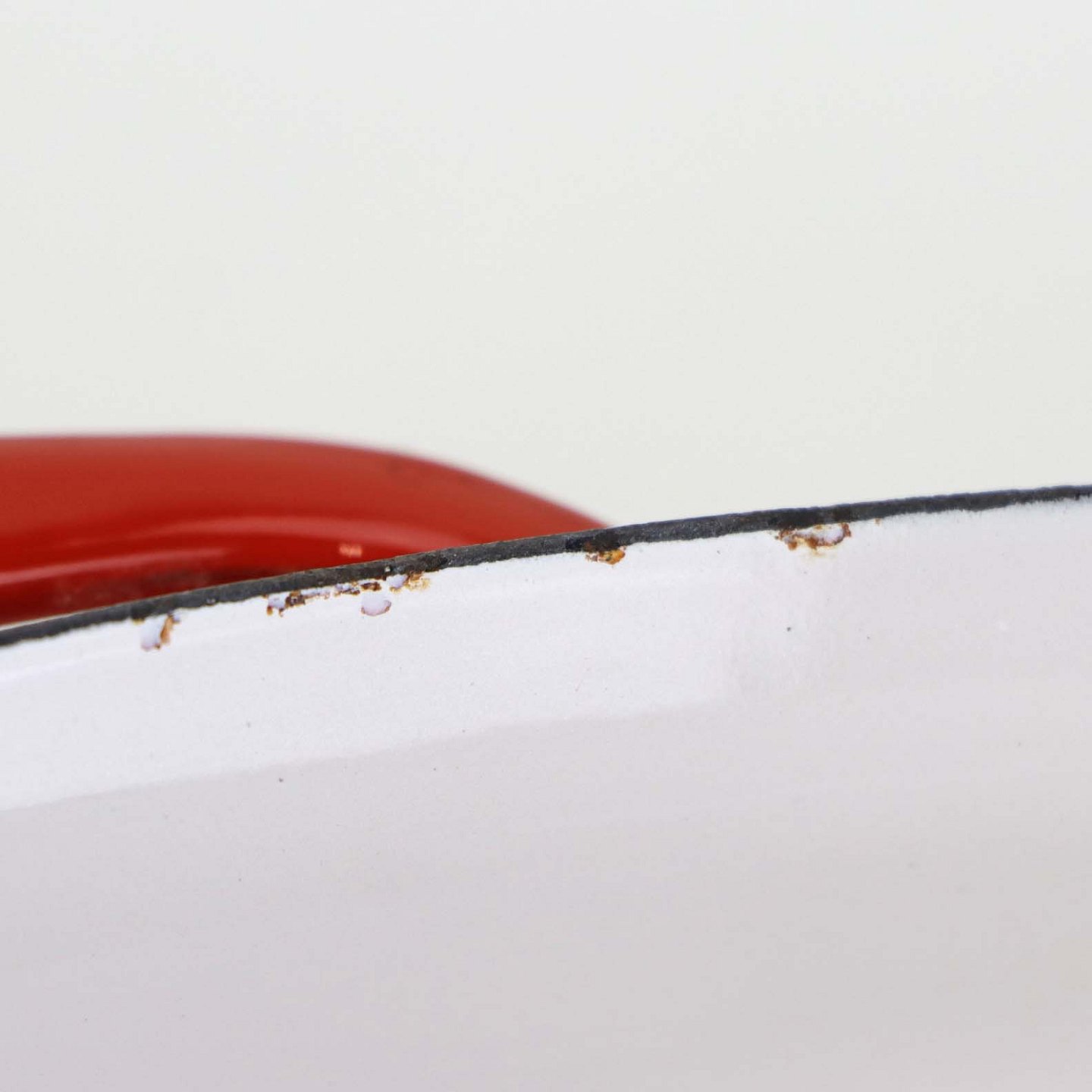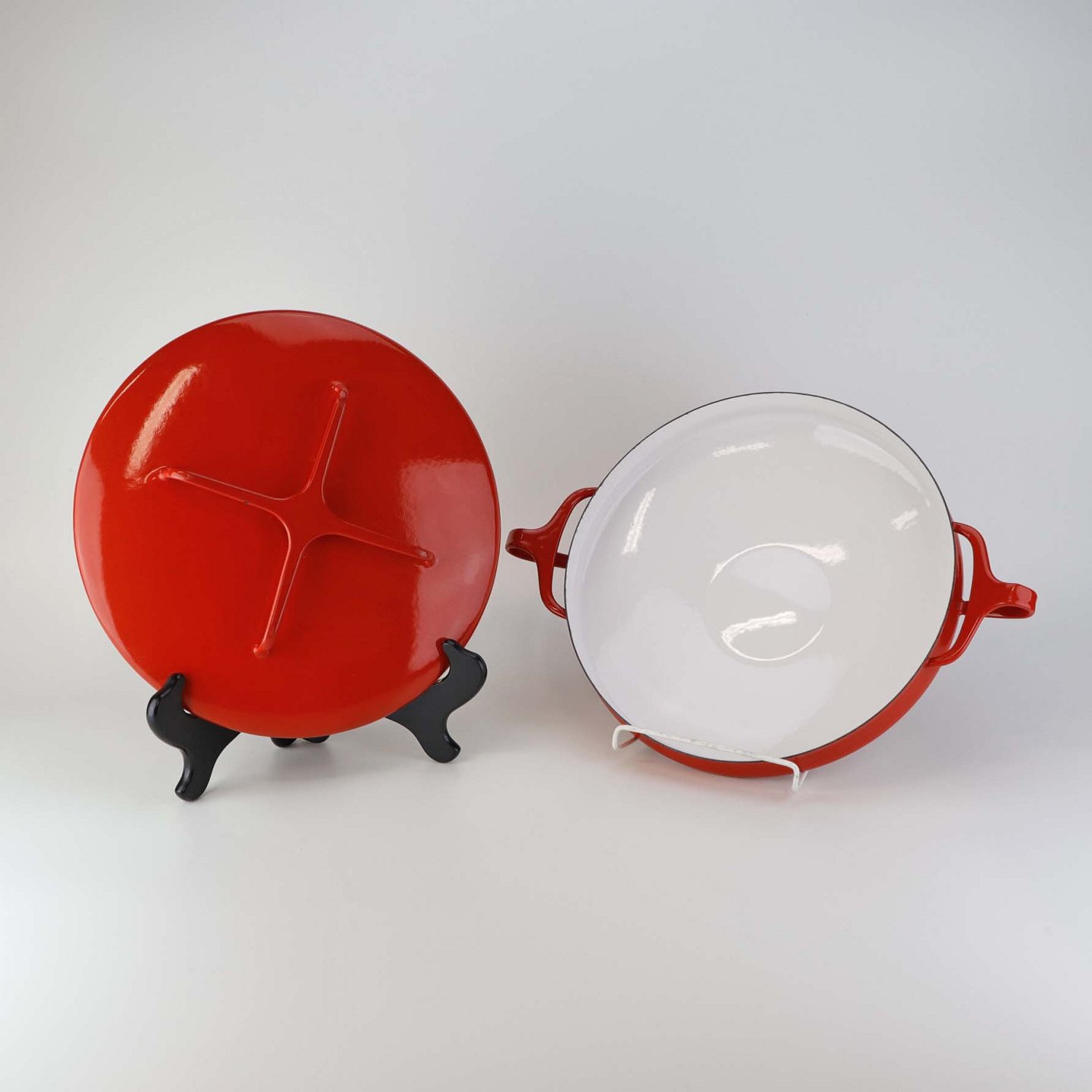 Kasserolle med låg fra serien Kobenstyle fremstillet i metal og belagt i rød og hvid emalje. Model France
