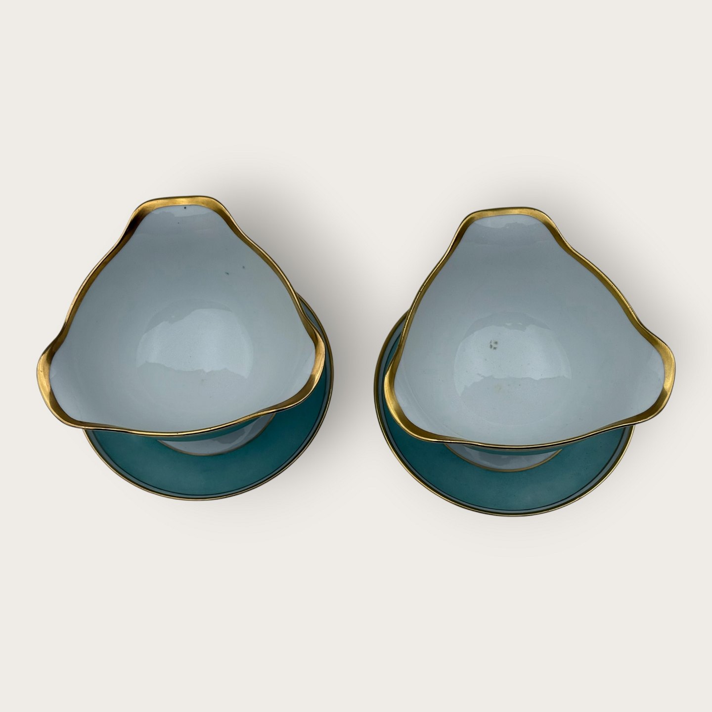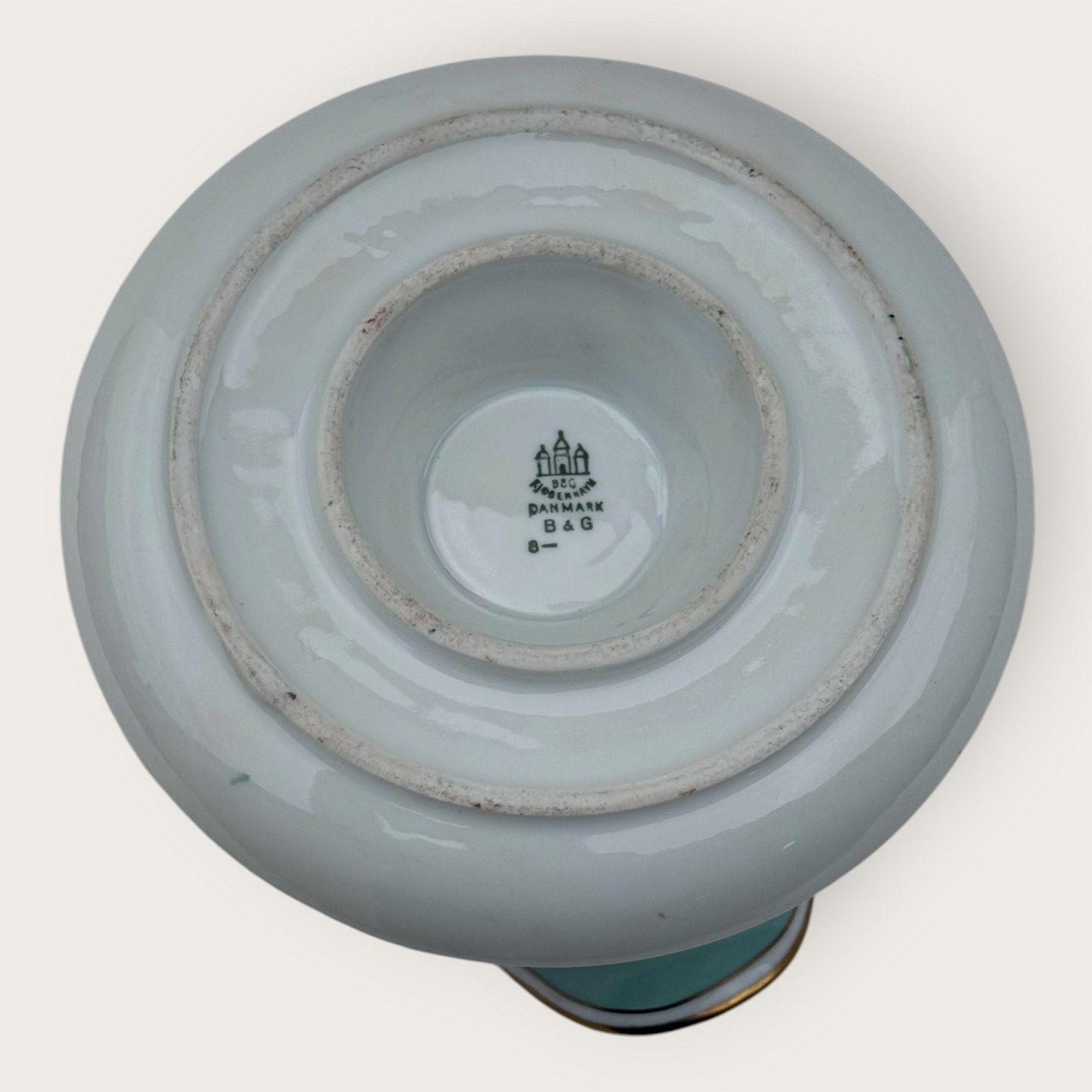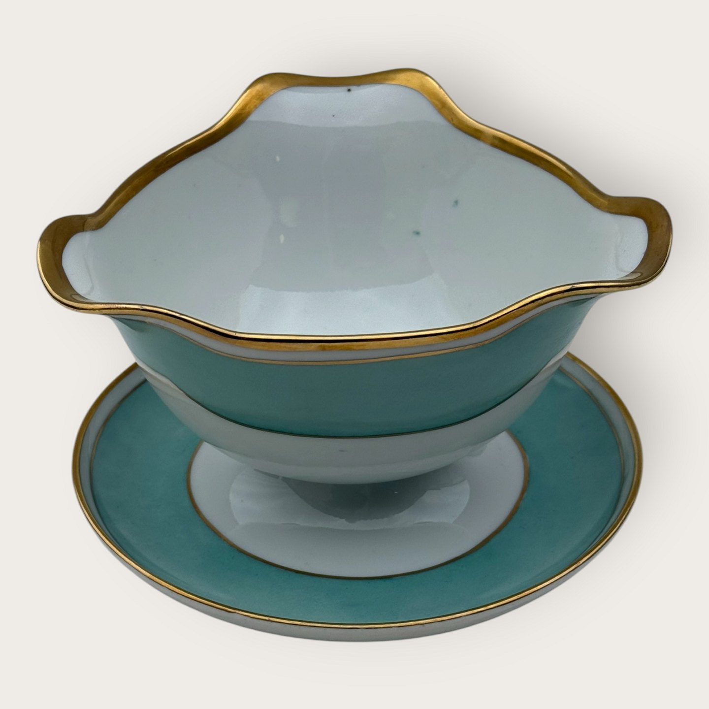 Bing & Grondahl, Form 643 mit breitem türkisfarbenem Dekor und Goldrand, Saucenschale, 10,5 cm hoch, 17 cm breit, 2. Wahl, *Einige kleine Flecken unter der Glasur (siehe Foto), ansonsten guter Zustand*