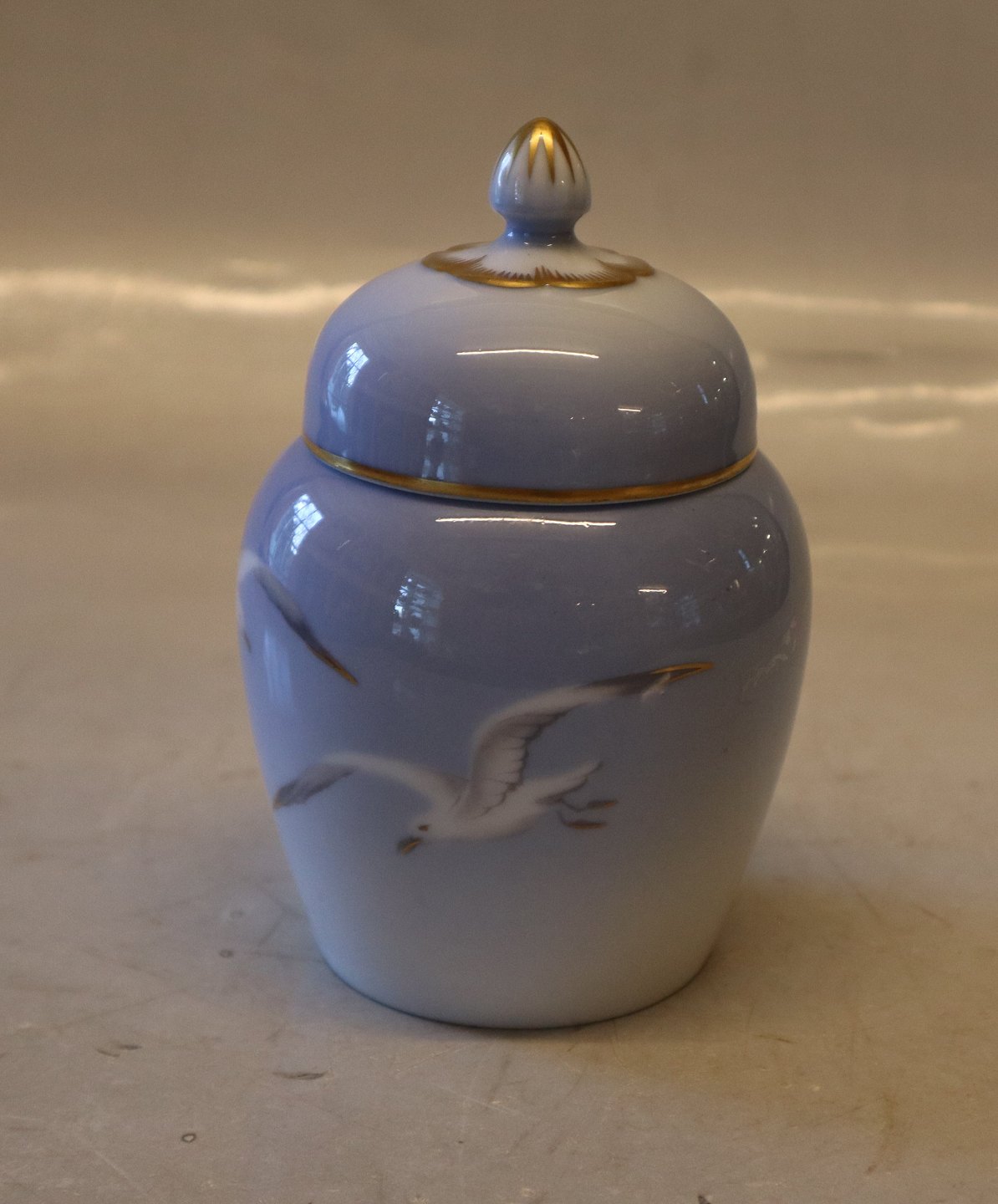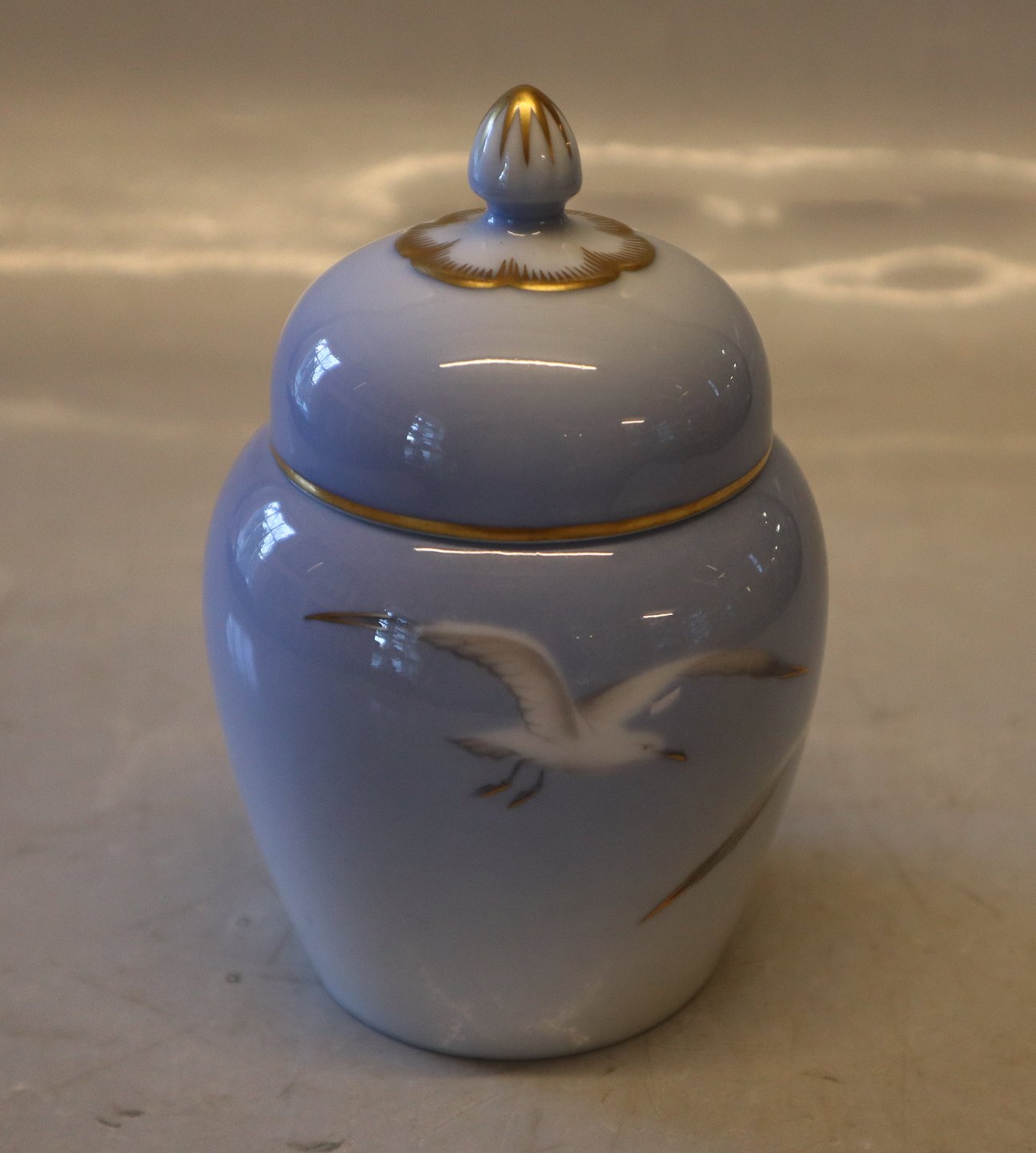 172 Marmeladekrukke med låg 13 cm Bing & Grøndahl Mågestel med guldkant. I hel og fin stand