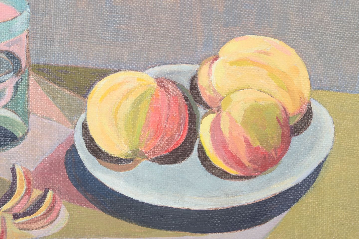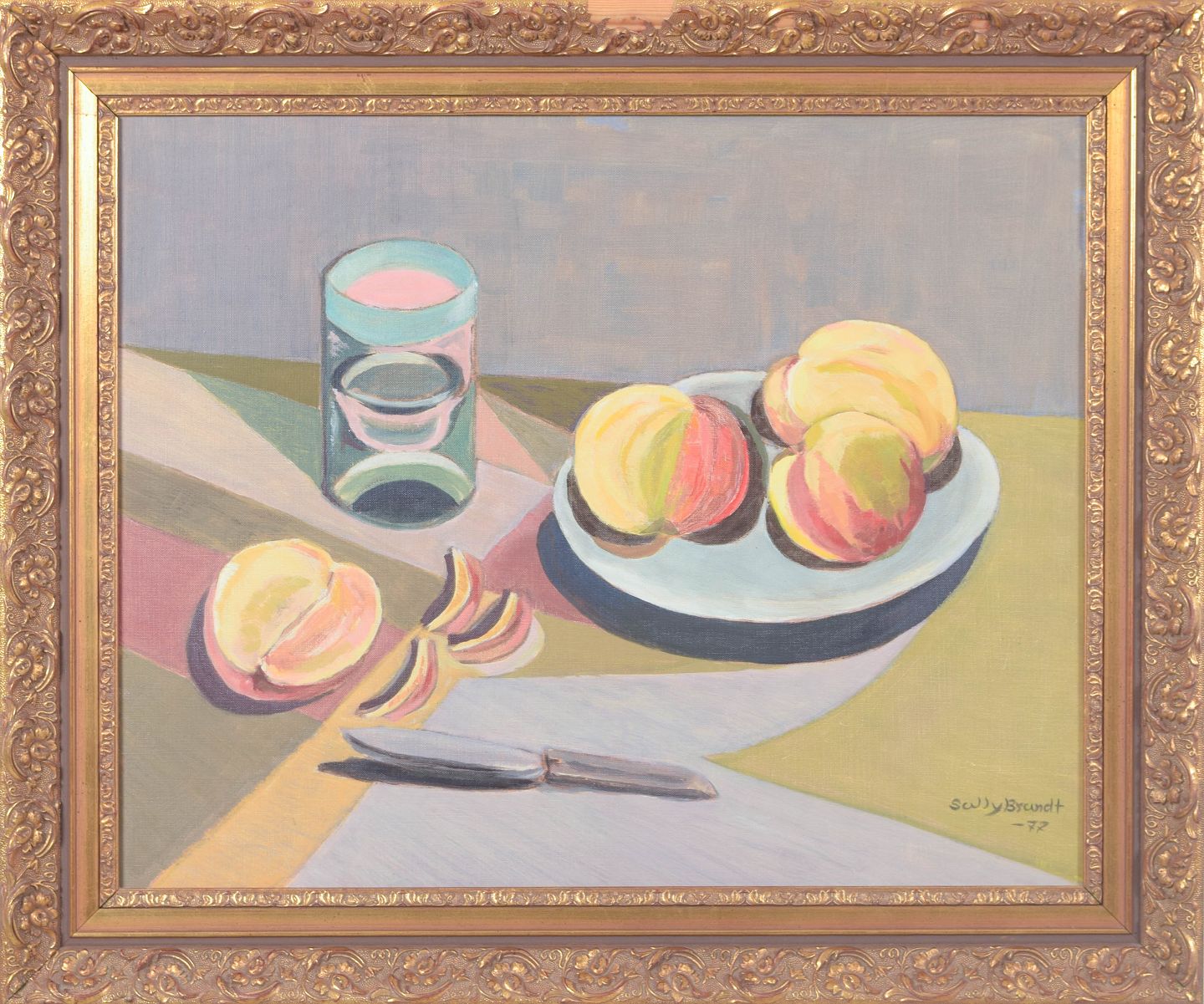 Modernistisk stilleben med frugt og glas opstillet i et roligt interiør, udført i en afdæmpet farvepalette med geometrisk opbygning. Kompositionen balancerer mellem figurativ gengivelse og stiliseret formsprog, signeret og dateret 1977.