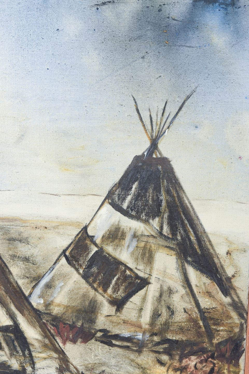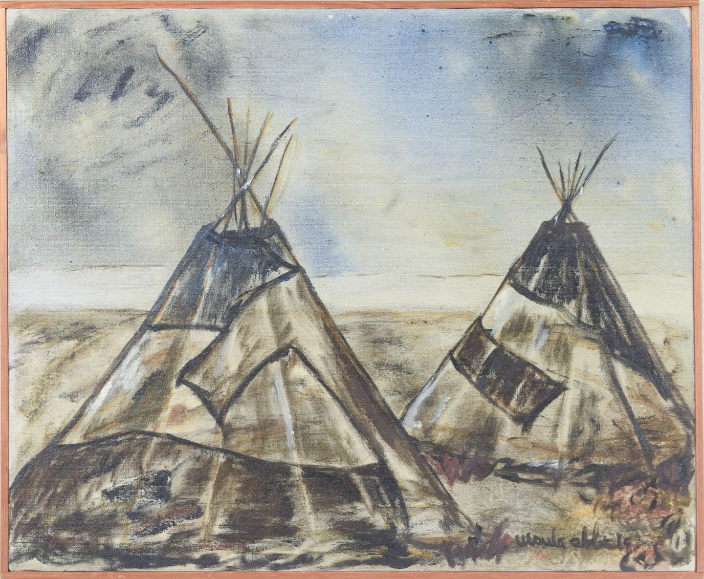 Modernistisk landskabsmotiv fra Lappland med samiske telte gengivet i en ekspressiv og let abstraheret form. Udført i dæmpede jordfarver med fri penselføring, signeret.