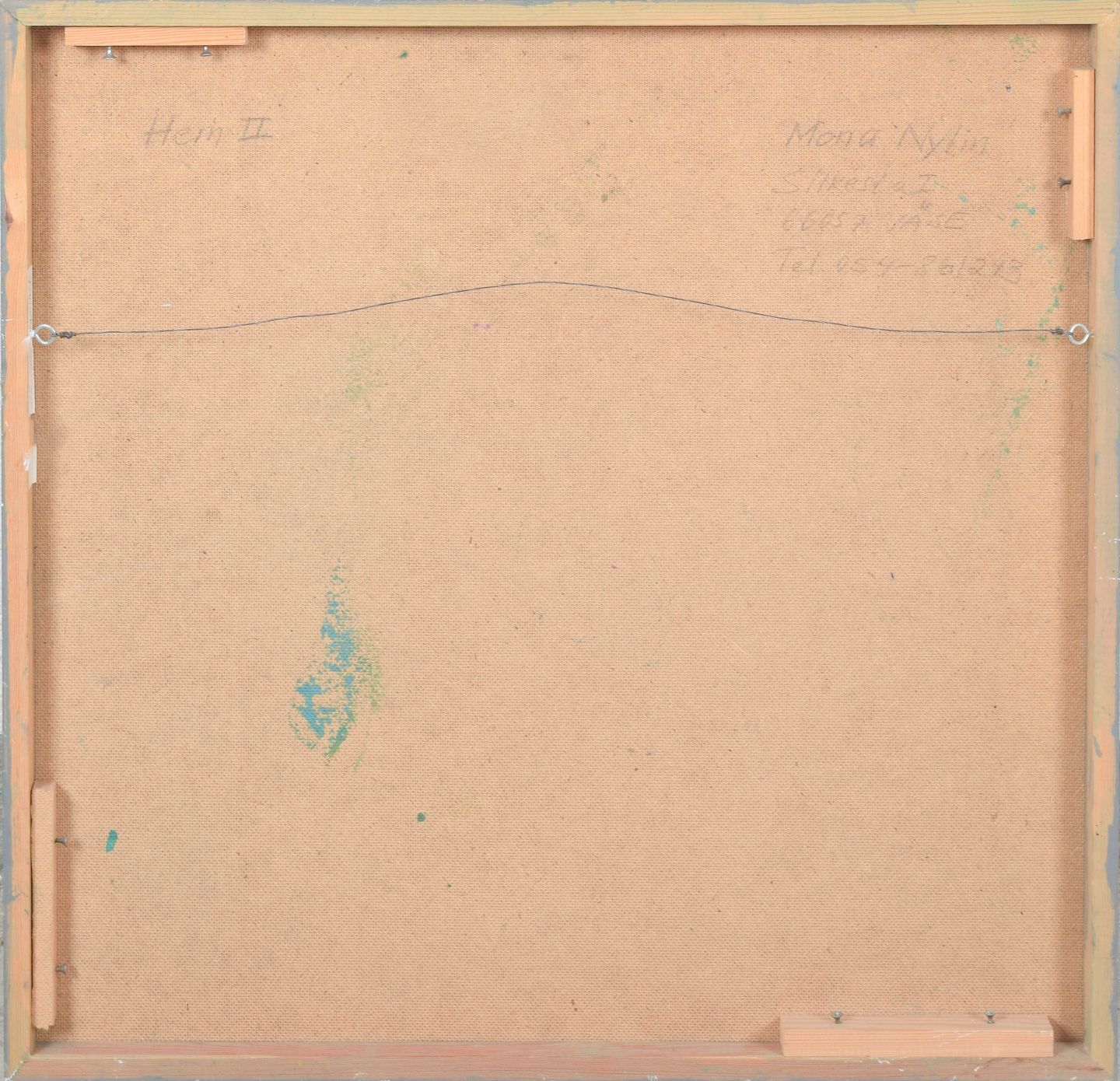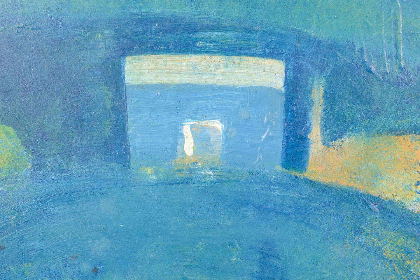 Abstrakt modernistisk komposition med bløde organiske former og afdæmpet farvepalette i blå og grønne nuancer. Centralt motiv med arkitektonisk antydning skaber en rolig, næsten drømmende rumlighed. Signeret og dateret 1993, betitlet "Hem II".