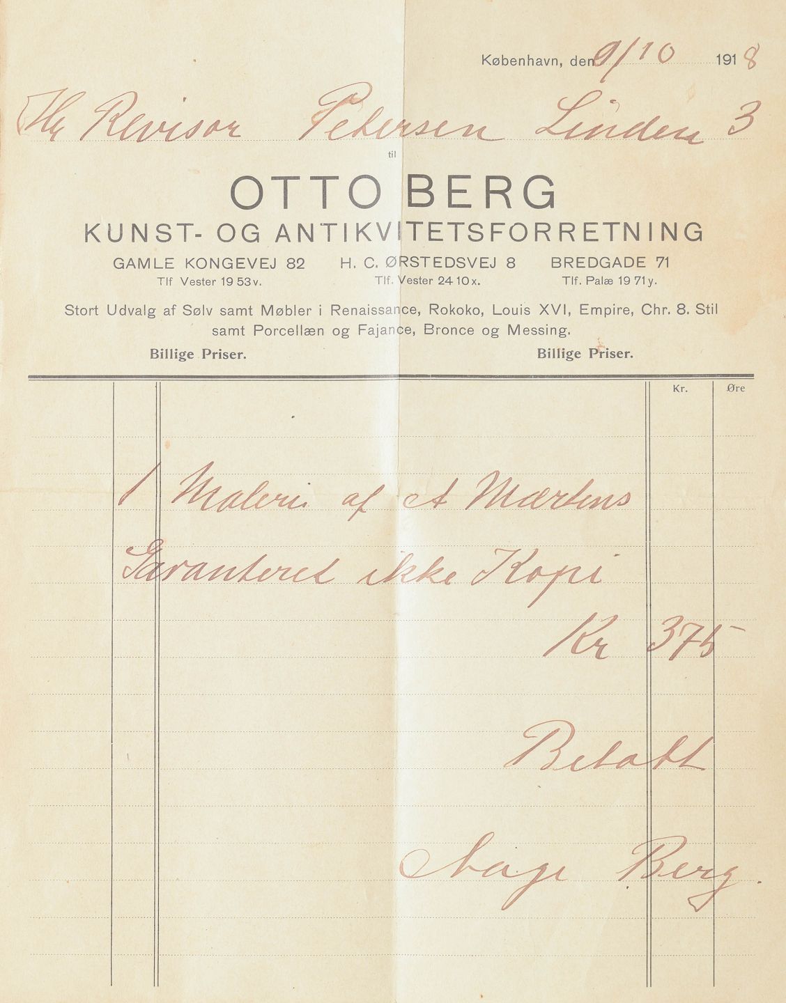 Ledsages af original faktura fra Otto Berg Kunst- og Antikvitetsforretning, København, dateret 1918.