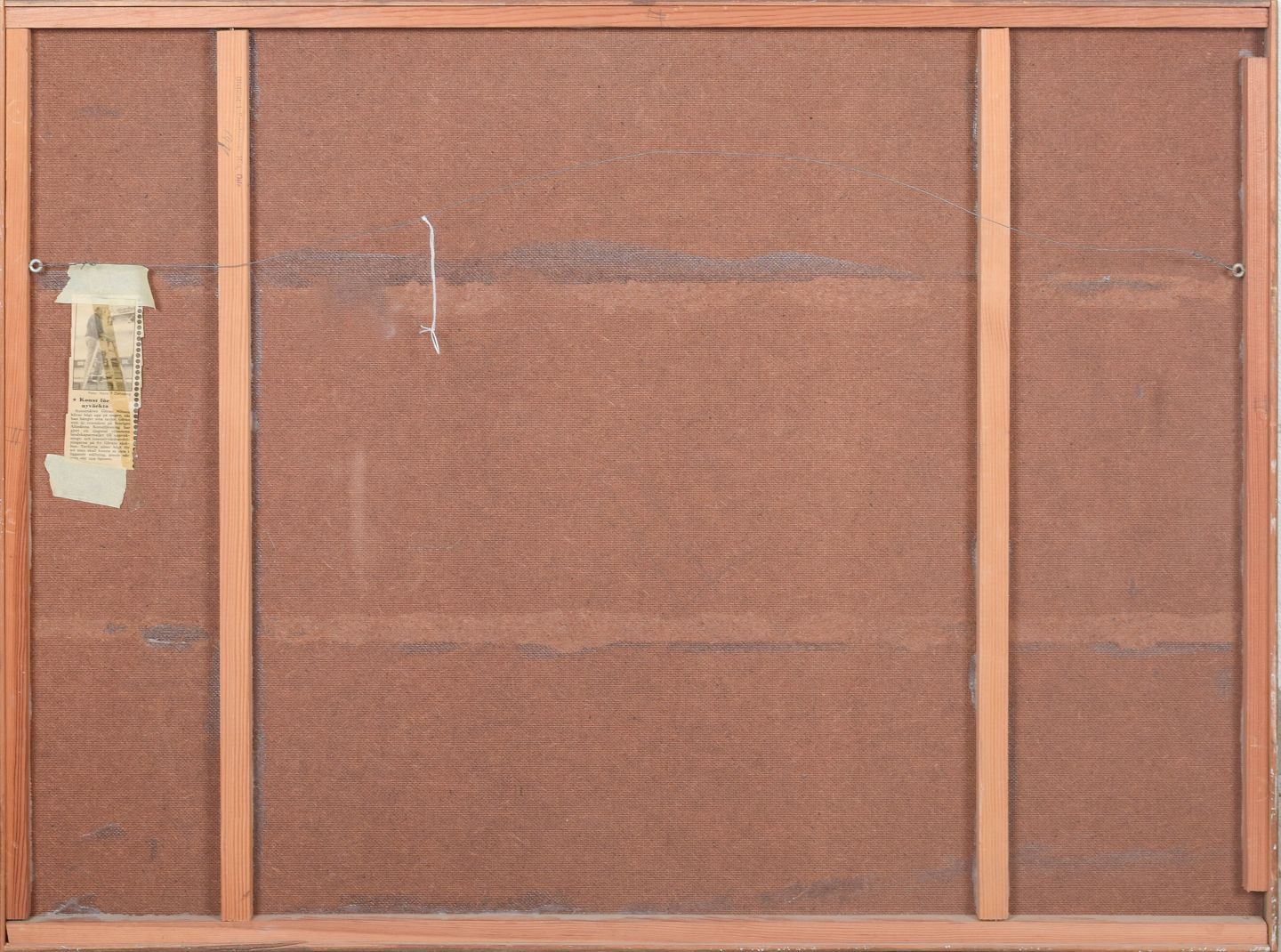 Abstrakt komposition udført i olie på plade med ekspressiv penselføring og lagdelte farvefelter i dæmpede rødlige og grå toner. Kompositionen fremstår med en balanceret spænding mellem struktur og spontanitet, signeret.