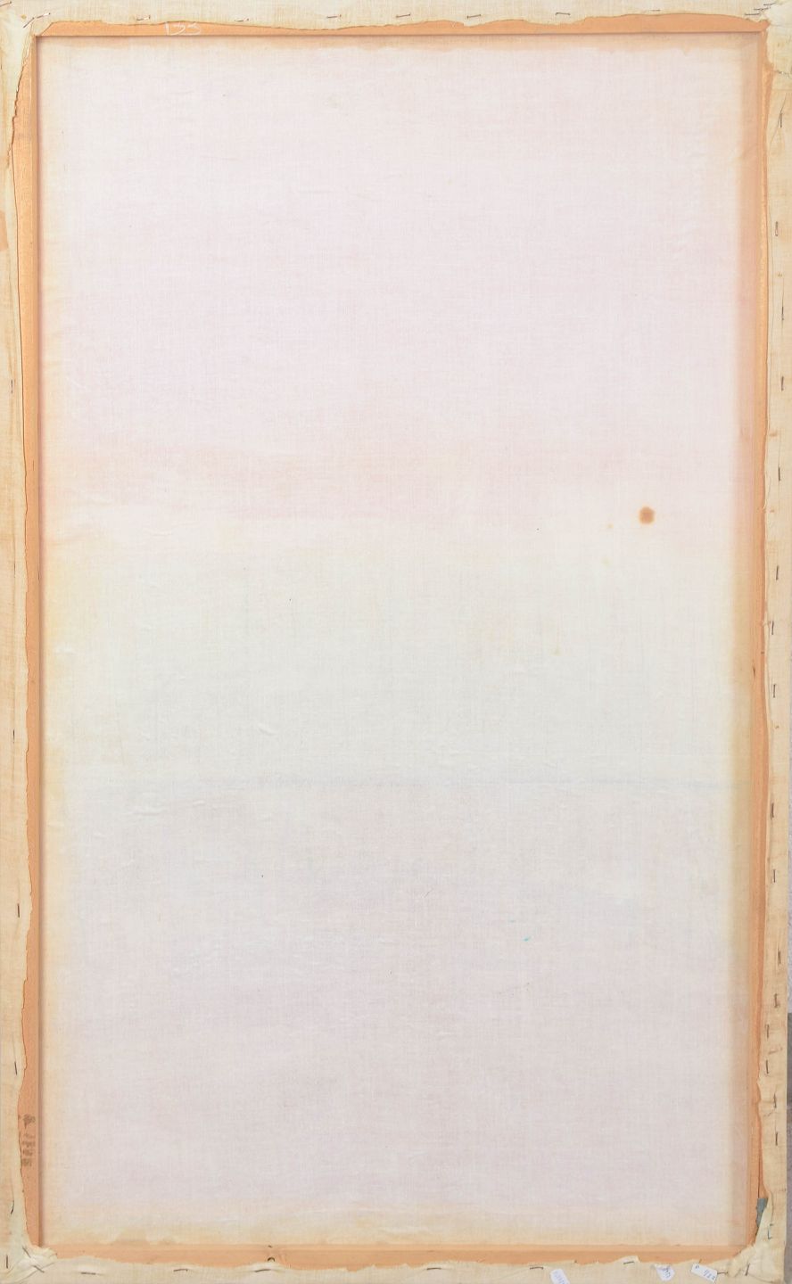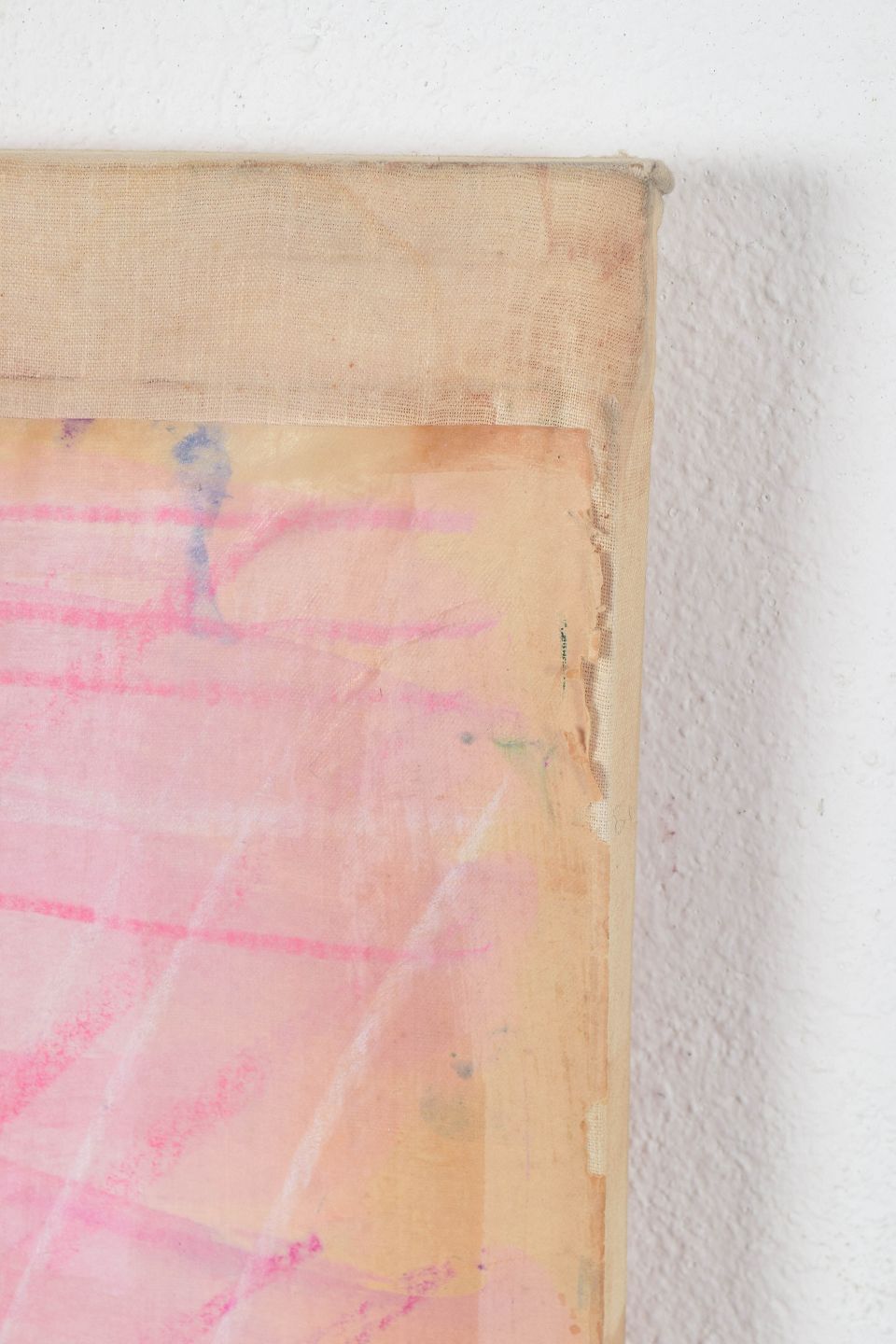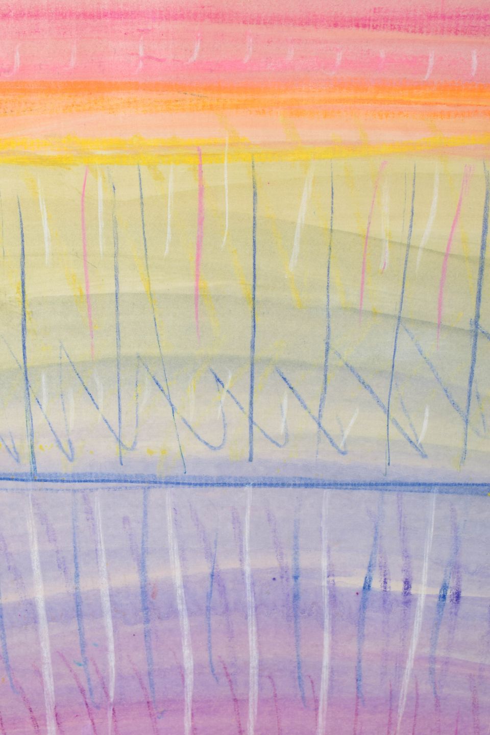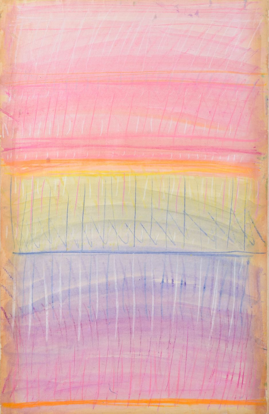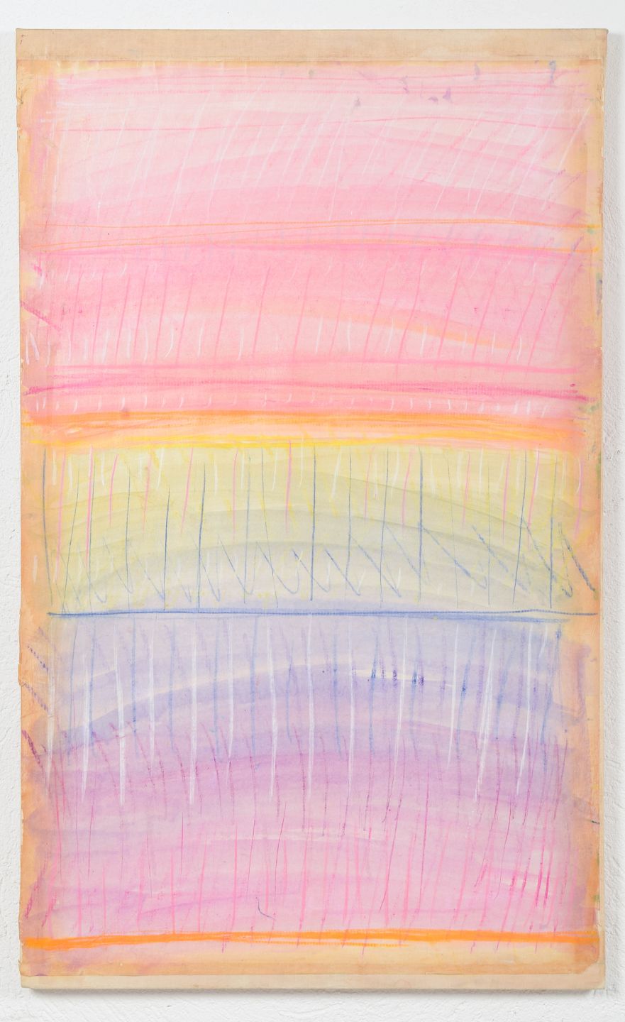 Abstrakt komposition udført på papir monteret på lærred, med horisontale farvefelter i lyserøde, gule og blå toner samt gestiske linjeføringer.
