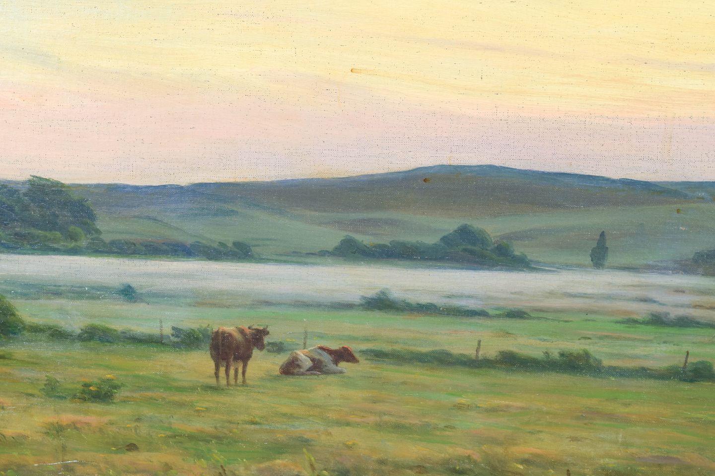 Naturalistisk landskab med græssende køer i åbent terræn under blød himmel, udført med fin farveafstemning og rolig stemning.