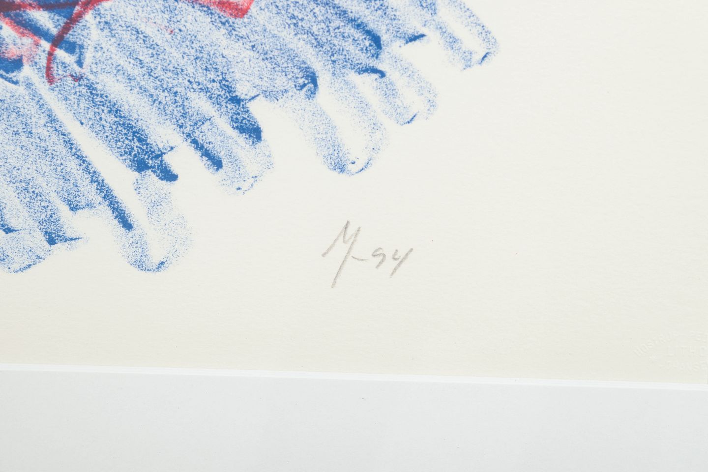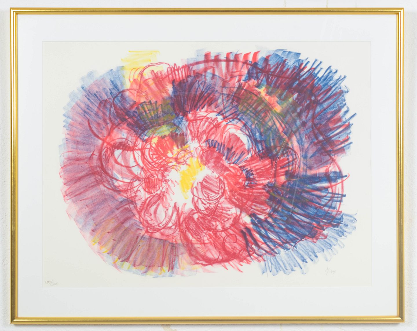 Abstrakt og ekspressivt motiv med dynamiske, cirkulære bevægelser i røde, blå og gule farveforløb, udført som farvelitografi, signeret og nummereret 189/300, dateret 1994.