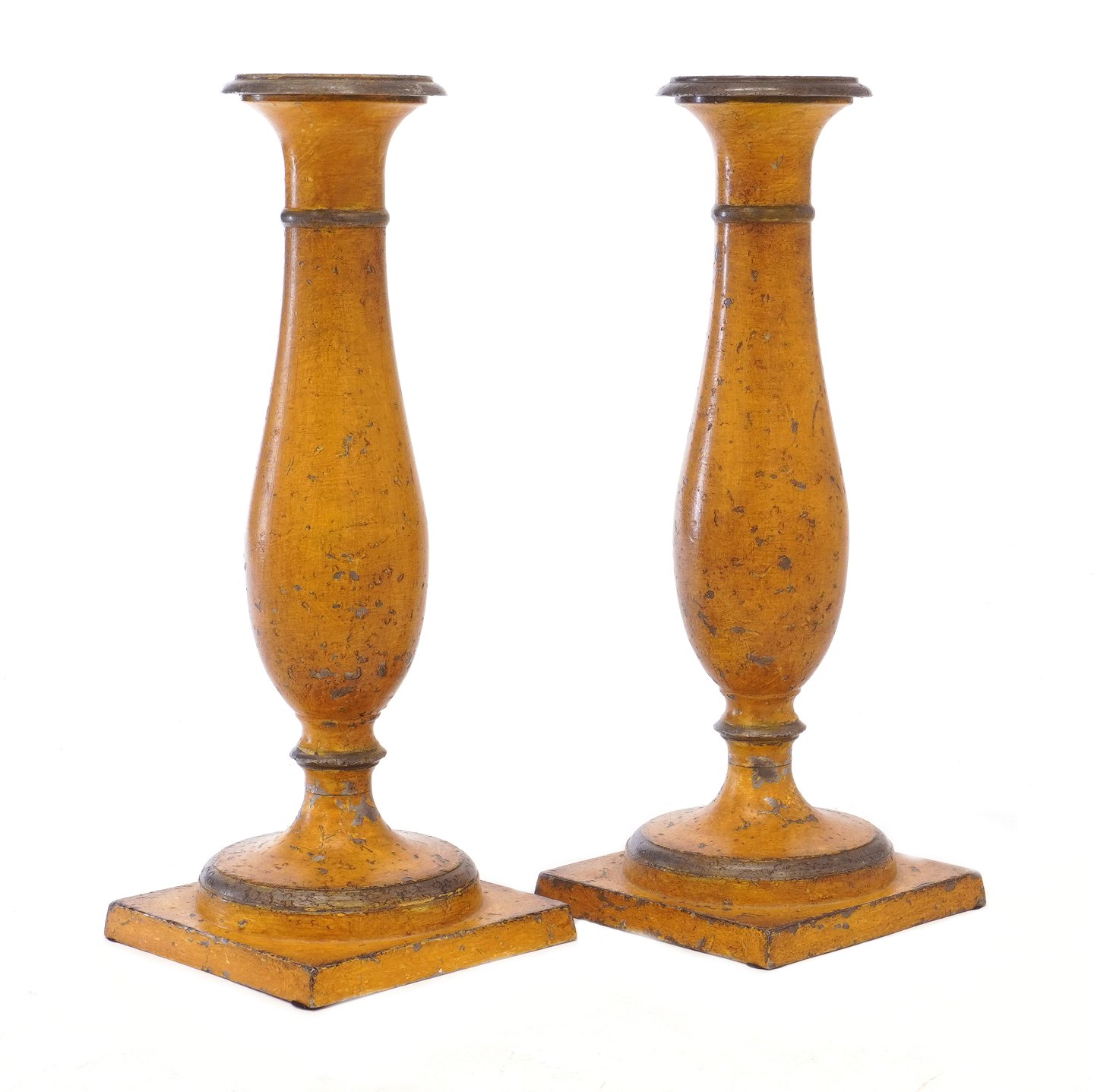 Ein Par gelbe Tulpenleuchter aus Zinn. Dänemark um 1840. H: 21cm
