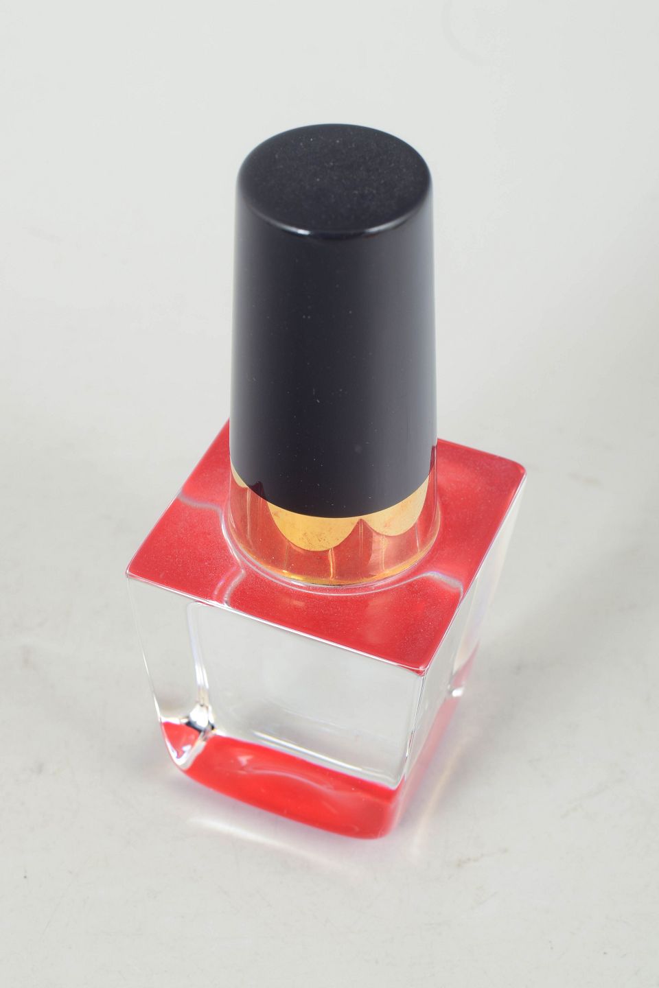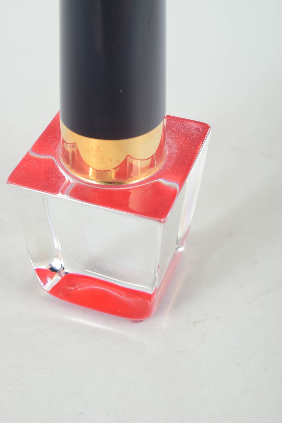 Geometrisk formet glasskulptur i form af neglelak udført i klart og farvet glas med massiv kvadratisk base og cylindrisk top i mørk tone.