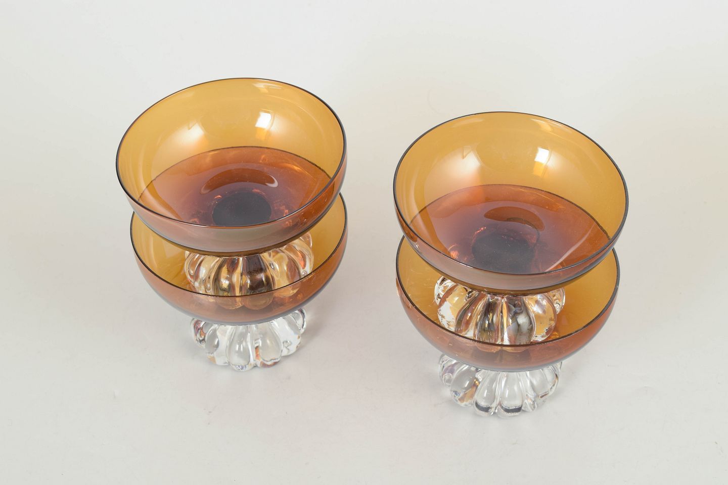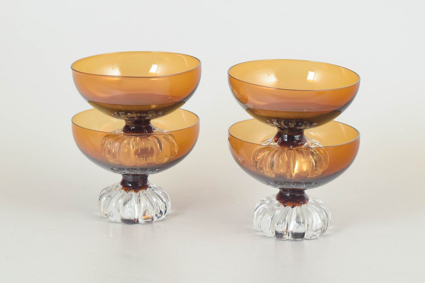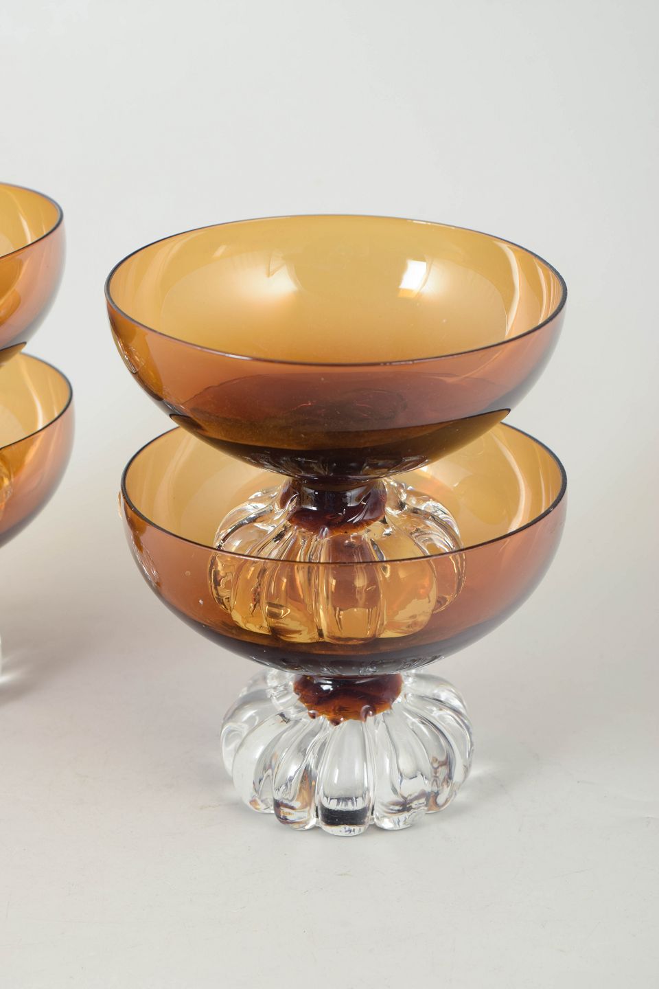 Elegante dessertskåle i mundblæst glas med ravfarvet kumme og dekorativ fod i klart glas med rillet struktur, typisk for svensk glasdesign fra perioden.
