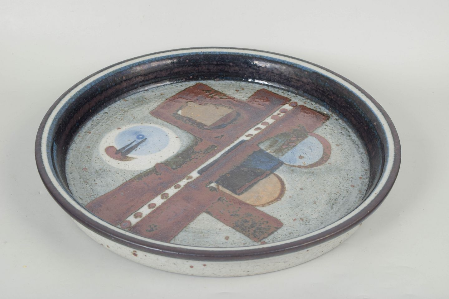 Stort rundt fad i stentøj med kunstnerisk dekoration i geometriske former og jordfarvede nuancer. Model Drejar-gruppen, fremstillet 1976.