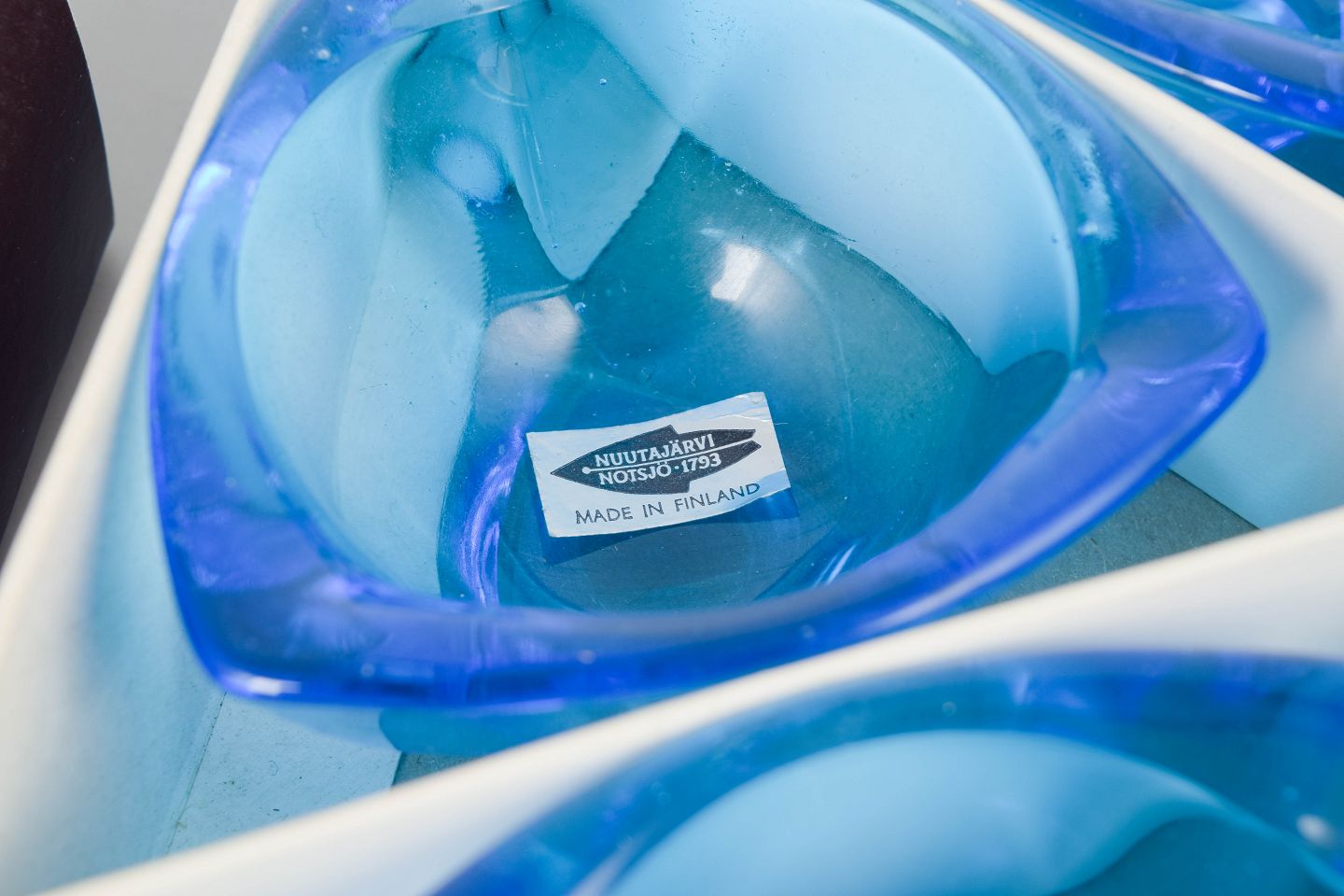 Organisk formede skåle i blåt glas, model “Bull’s eye”, med originale mærkater og æske.