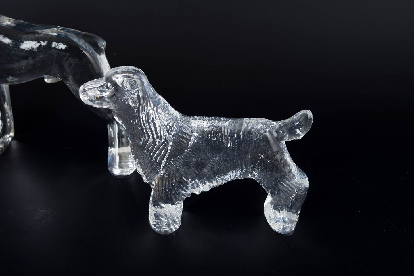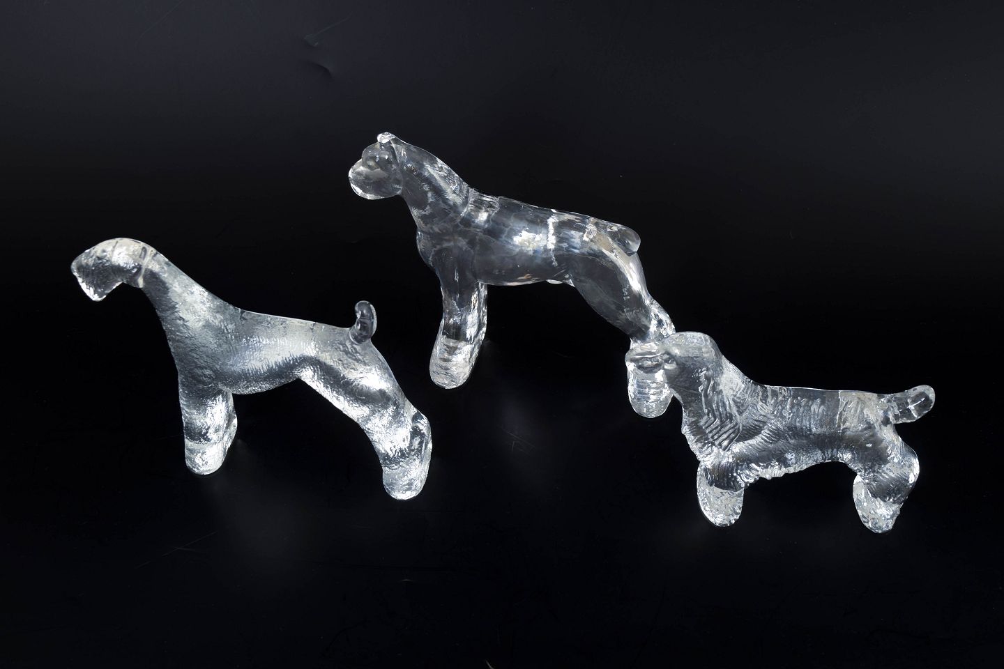 Dekorative glasfigurer udført i klart presset glas med struktureret overflade, forestillende tre hunde i forskellige positurer. Model “Kennel” fra Kosta Boda.
