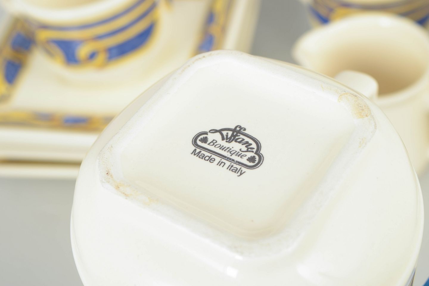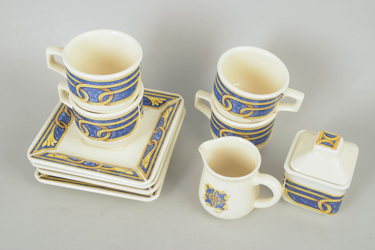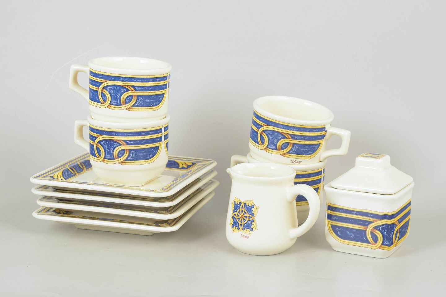 Text zugänglich auf Dänische: Tiffany Boutique, sæt af fire kaffekopper med underkopper, sukkerskål og flødekande.