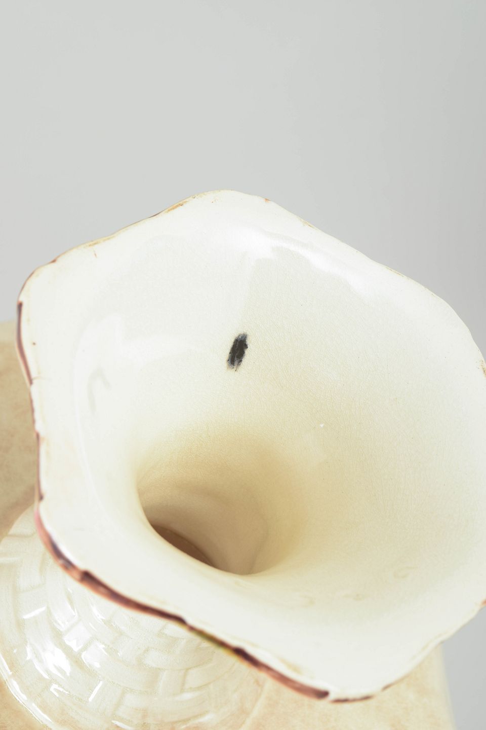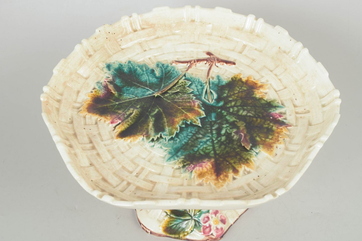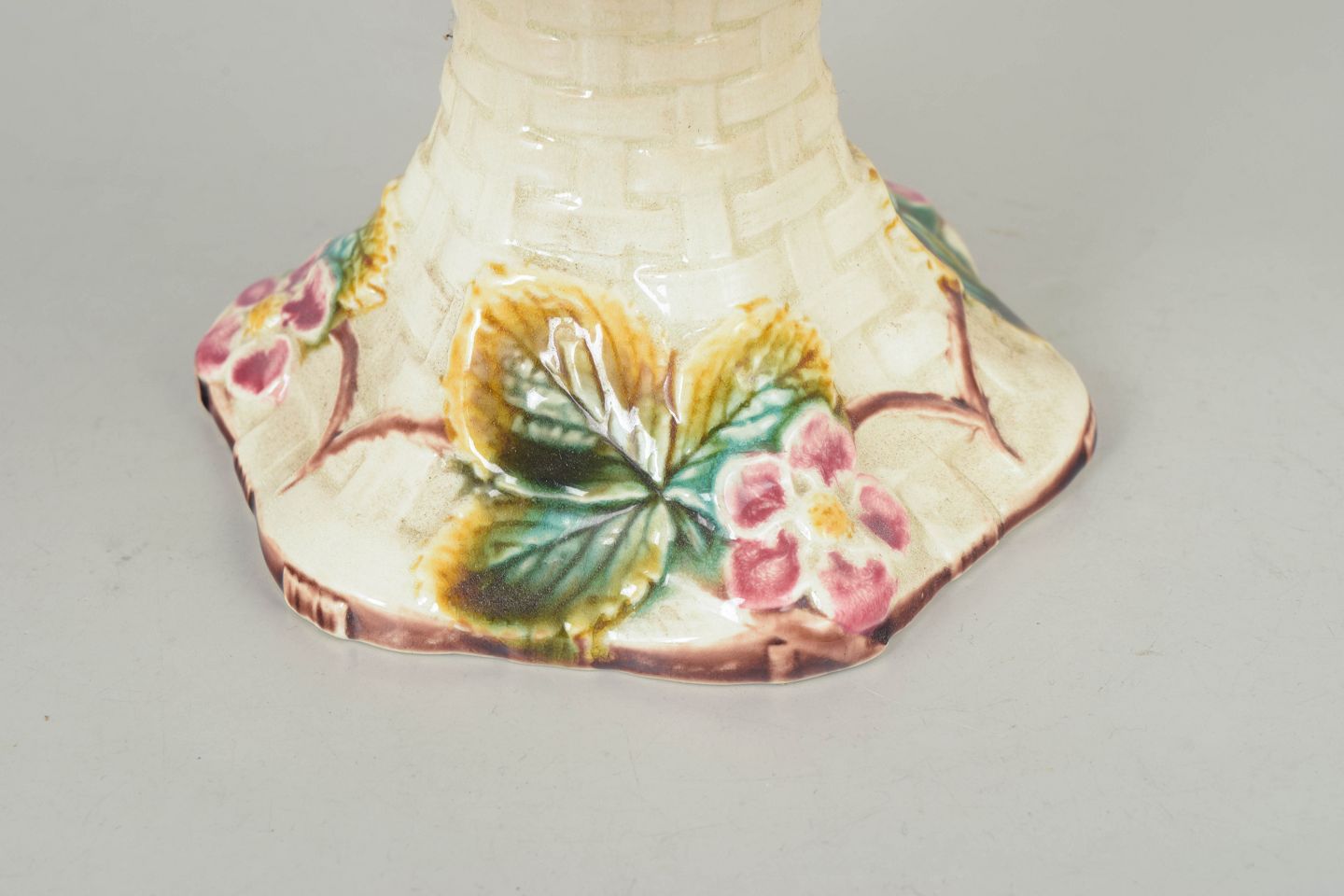 Dekorativ opsats i glaseret keramik med reliefpræget og naturalistisk blomsterdekoration samt iriserende glasur i fadet. Fremstillet i majolika med karakteristisk farverig og detaljeret overflade.