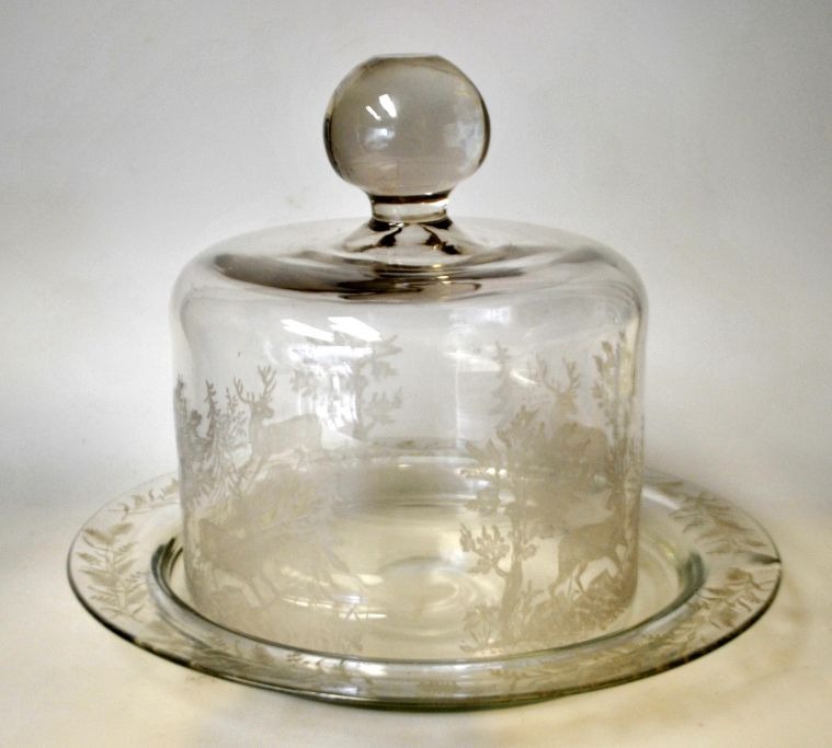 Käseglocke mit Hirschmotiv und passender Schale, um 1910. Holmegård, Dänemark. Korpus mit Hirschen zwischen Bäumen verziert. Schale mit Blumen verziert. Höhe: 16 cm. Durchmesser Schale: 21 cm.
