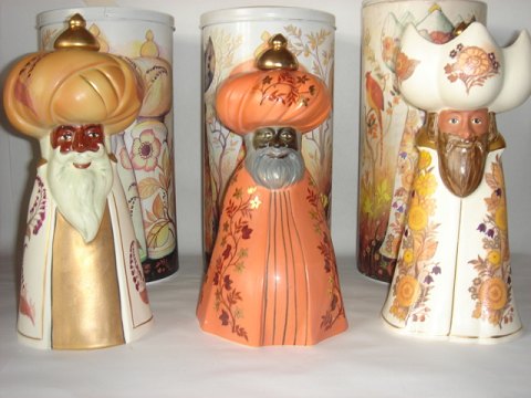 Text zugänglich auf Dänische: Mads Stage tegnede og udførte i midten af 1980'erne De hellige 3 konger Baltazar, Melchior og Kaspar for Imerco. Figurerne er håndmalet og belagt med 24 karat guld. På toppen af hatten sidder løs guldtop. Original metalæske til hver enkelt medfølger.
