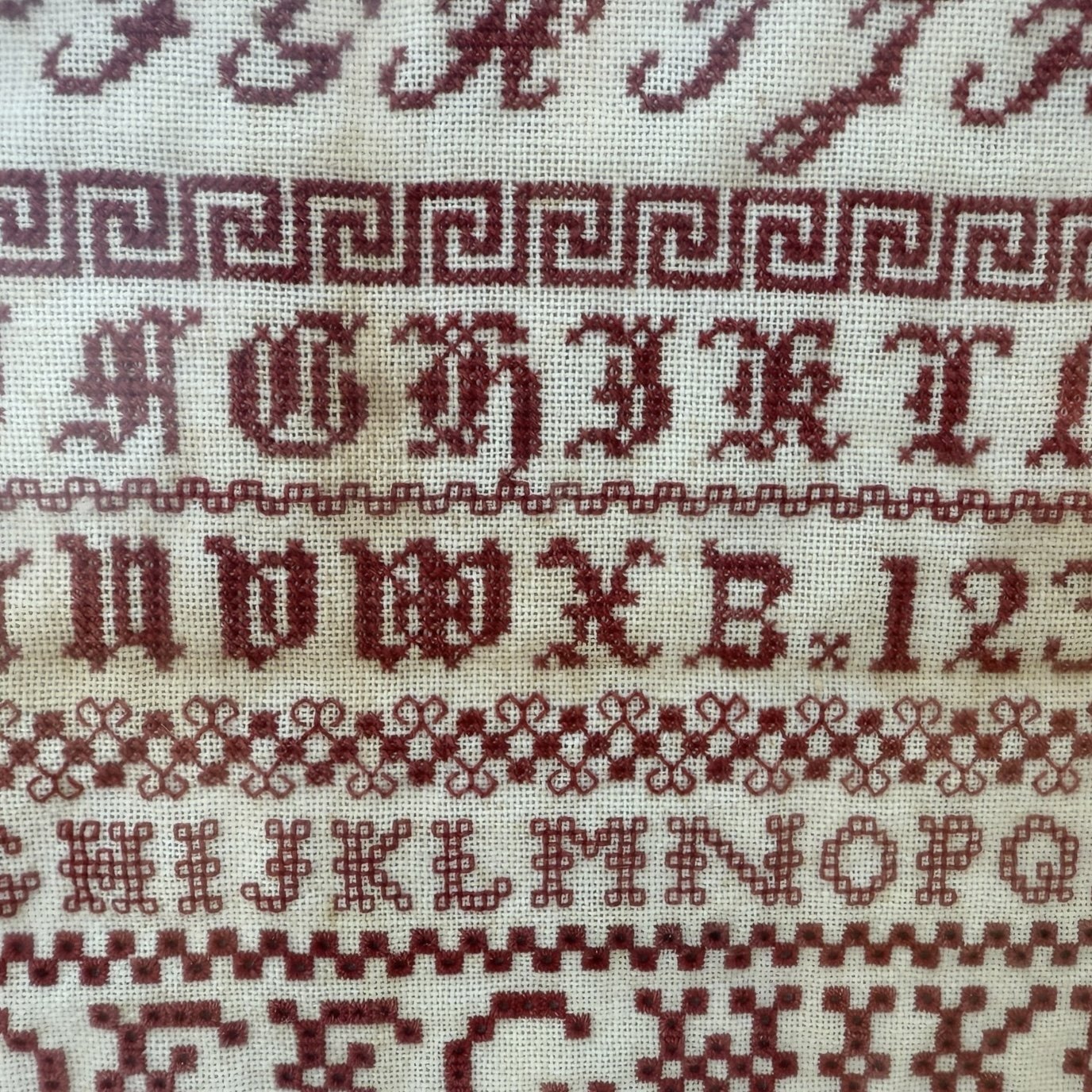 Indrammet Broderi / navneklud, Marie Ludvigsen 1890, Rammemål: 40x38,5cm, Svage skjolder i midten (se foto) ellers pæn stand.