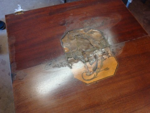 Der Tisch hatte einen Wasserschaden auf der Oberseite der Platte und an den Klappen. Wir haben den Tisch restauriert und neue Intarsien eingelegt. Siehe Foto vor und nach.