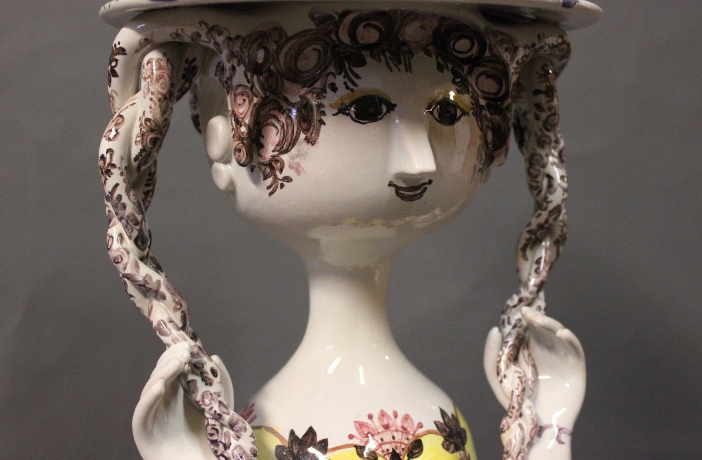 Diese große Bjørn-Wiinblad-Figur wurde repariert, nachdem sie in mehrere Teile zerbrochen war. Siehe Vorher- und Nachherbilder.