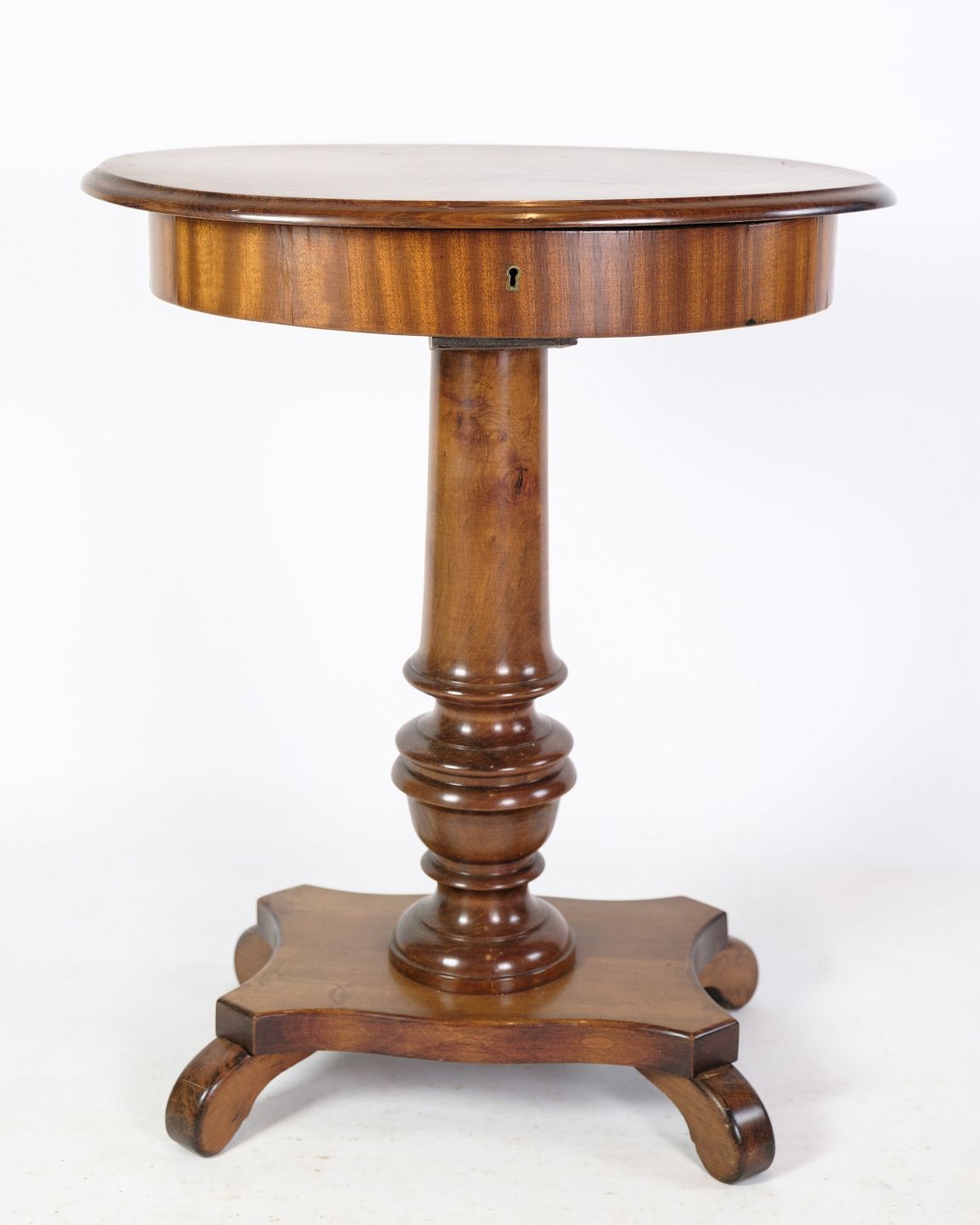Ovaler Näh- bzw. Lampentisch auf Säule aus Mahagoni mit Nähfach aus der Zeit um die 1890er Jahre.