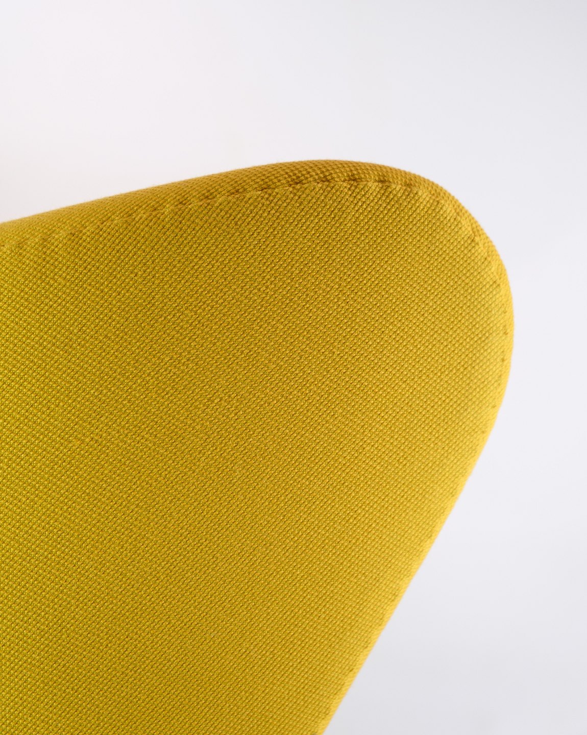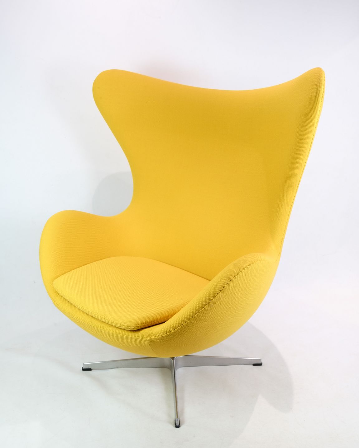 Wir haben eine sehr schöne Neupolsterung des Egg in einem currygelben Stoff von höchster Qualität vorgenommen. The Egg ist ein ikonischer Sessel, Modell 3316, entworfen vom berühmten dänischen Architekten und Designer Arne Jacobsen und hergestellt von Fritz Hansen. Der neue Stoff verleiht dem Sessel ein frisches und modernes Aussehen und bringt ihn auf den heutigen Stand in Bezug auf Stil.