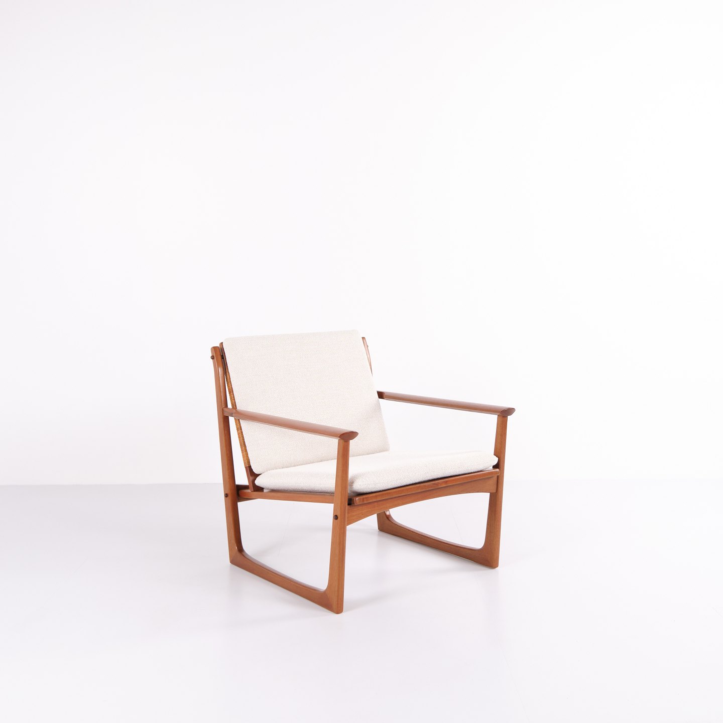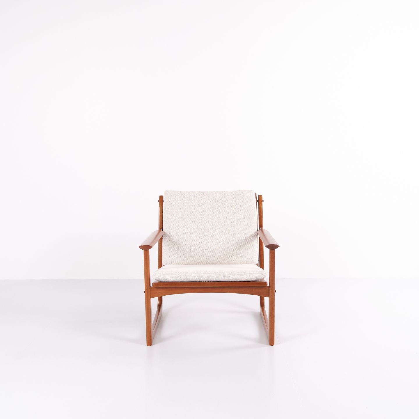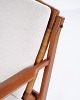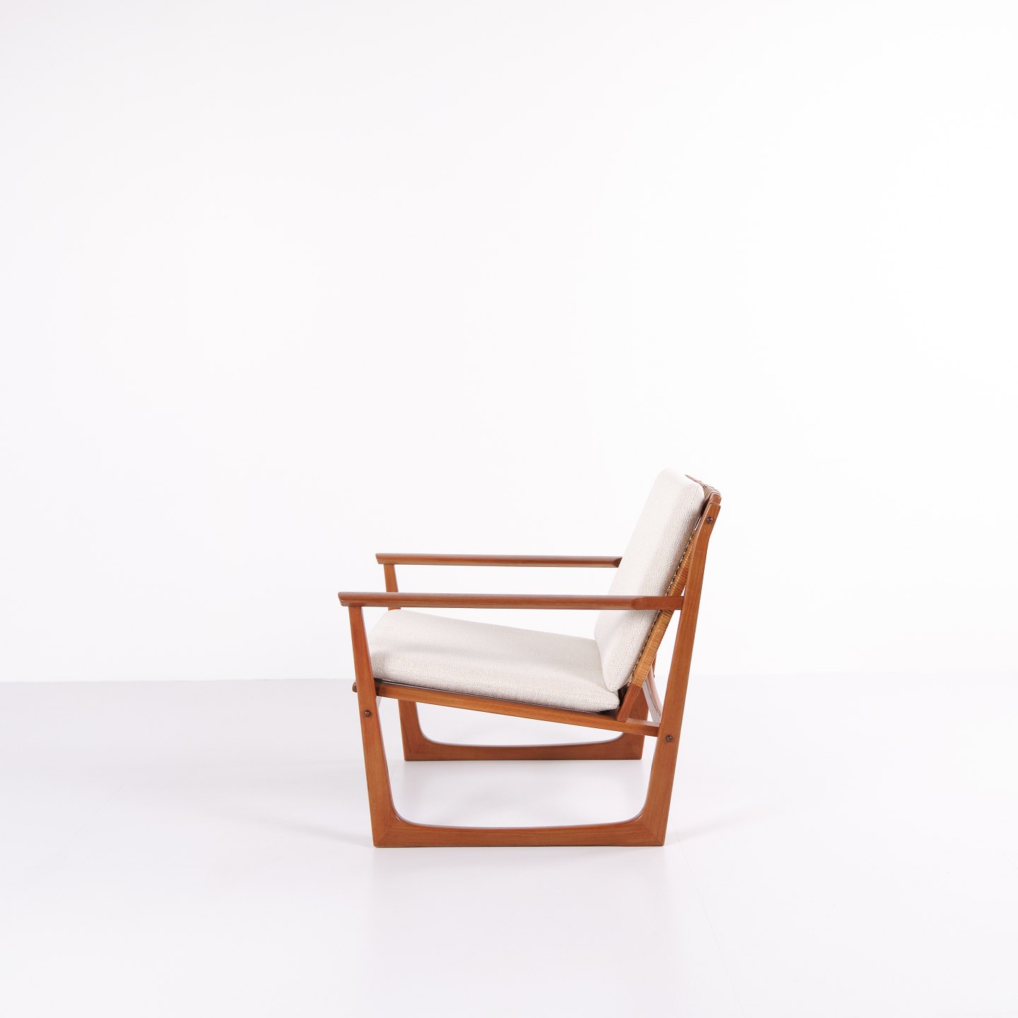 Sessel von Hans Olsen, gefertigt von Selig in den 1960er-Jahren. Aus massivem Teakholz mit elegant geformten Armlehnen und Beinen, bezogen mit hellem Stoff, der die warme Holzstruktur und das harmonische Design unterstreicht.