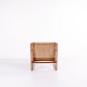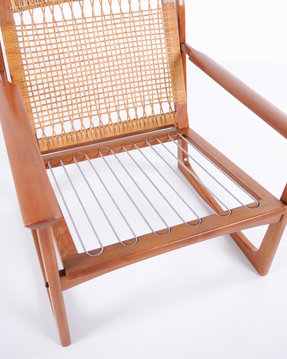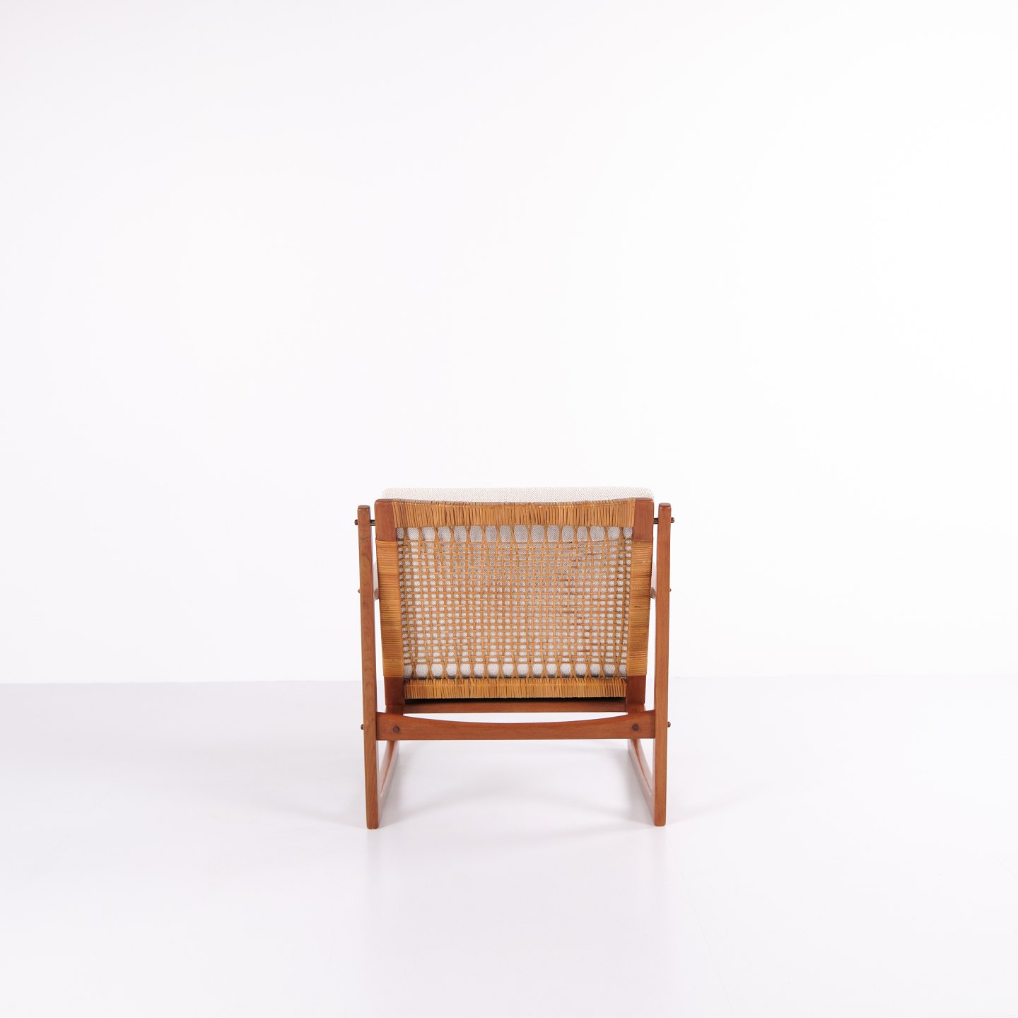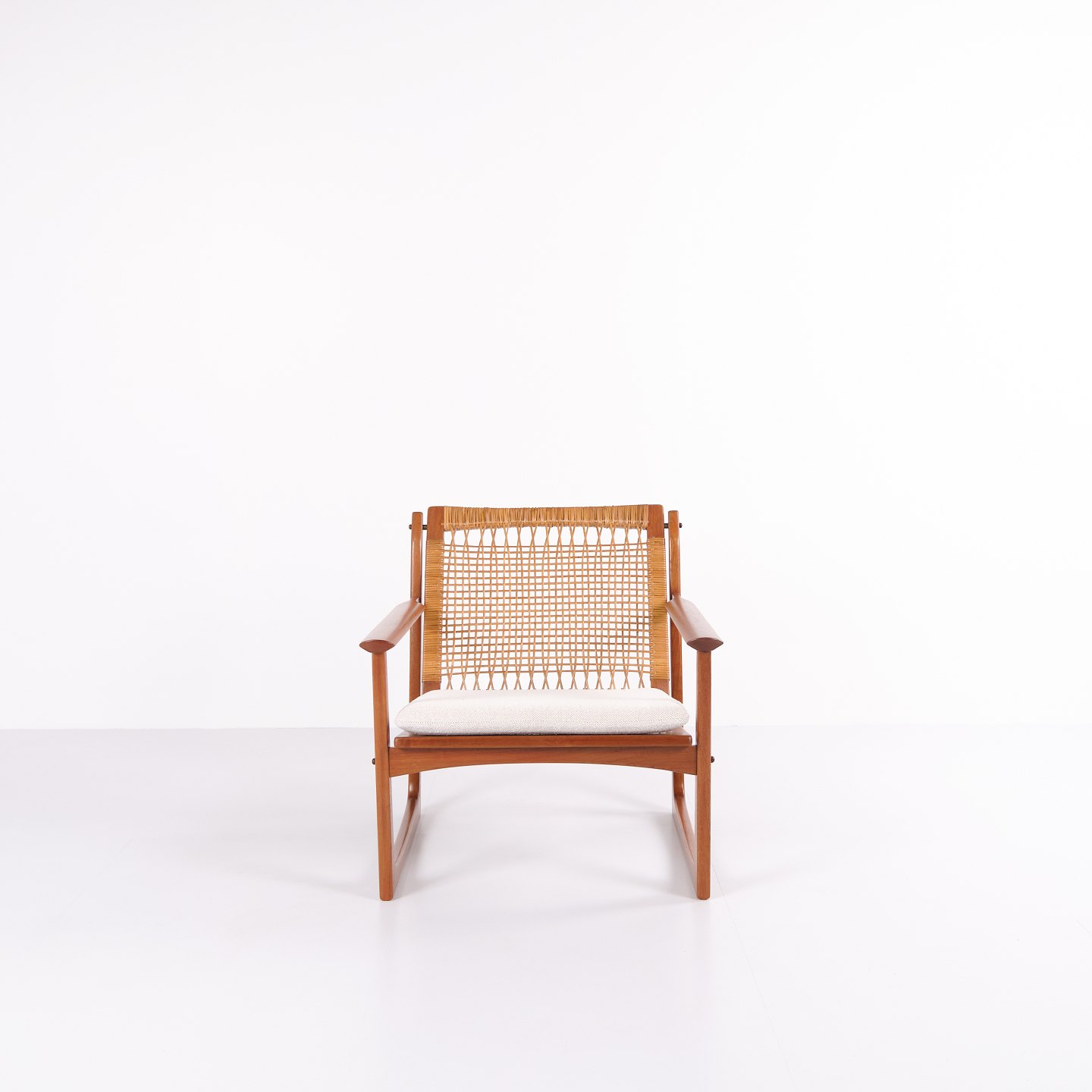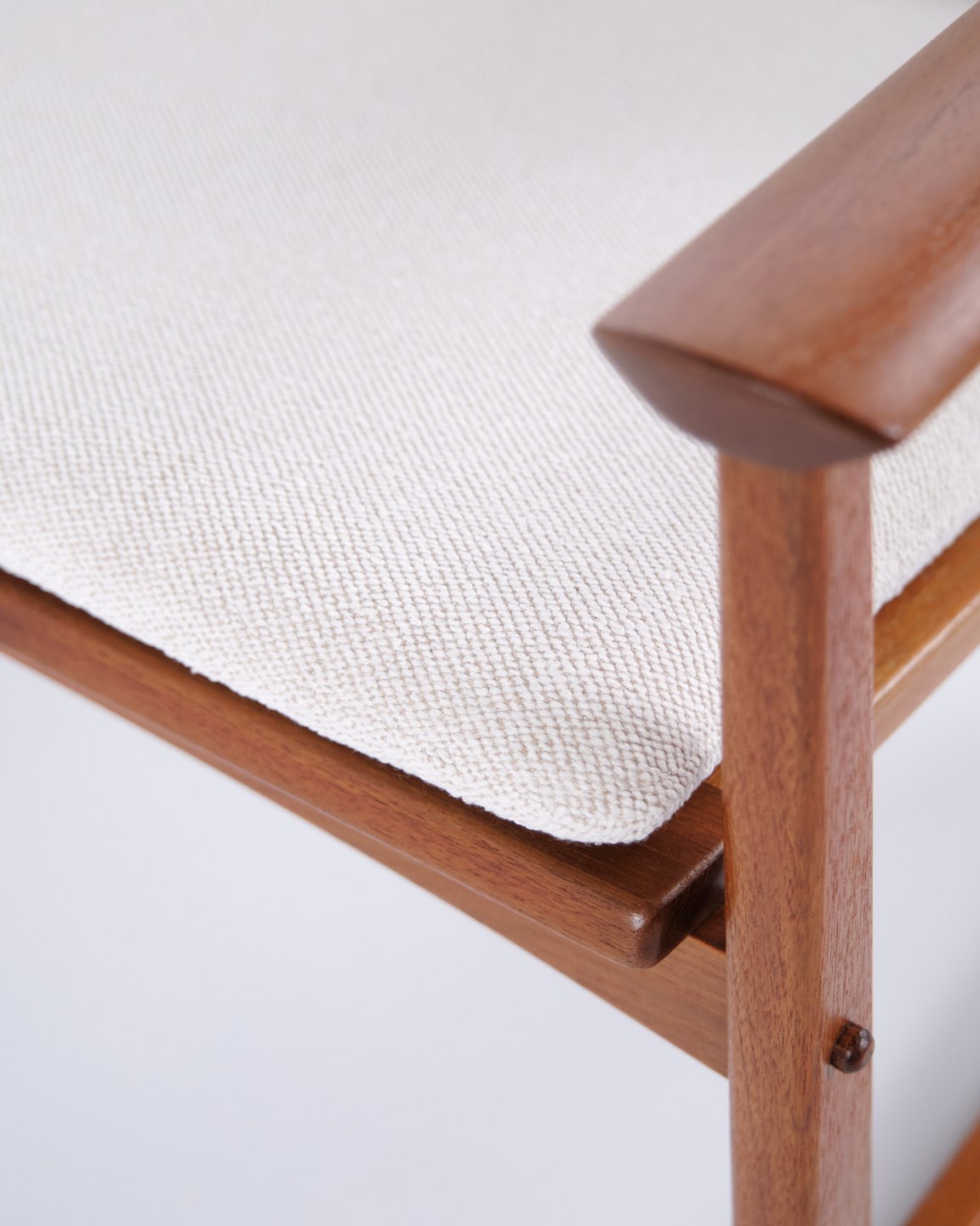 Sessel von Hans Olsen, gefertigt von Selig in den 1960er-Jahren. Aus massivem Teakholz mit elegant geformten Armlehnen und Beinen, bezogen mit hellem Stoff, der die warme Holzstruktur und das harmonische Design unterstreicht.