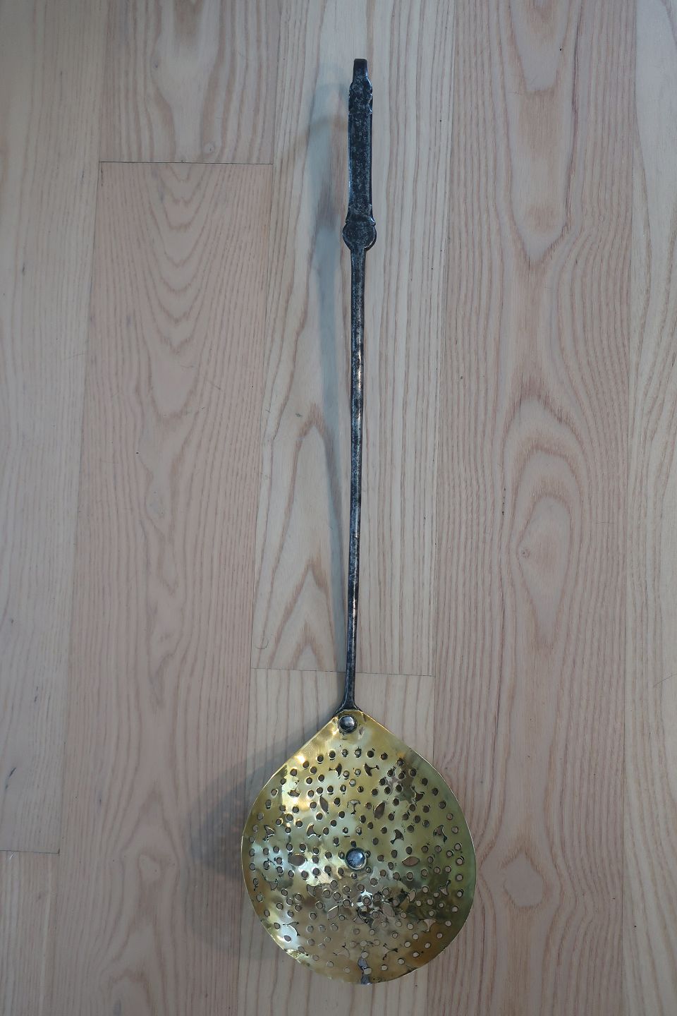 Skimmer made of brass, no stamp, about 1820 With a beautiful iron - handmade -handle L.: 62cm In a good condition with a little welldone repair Articleno.: KH15