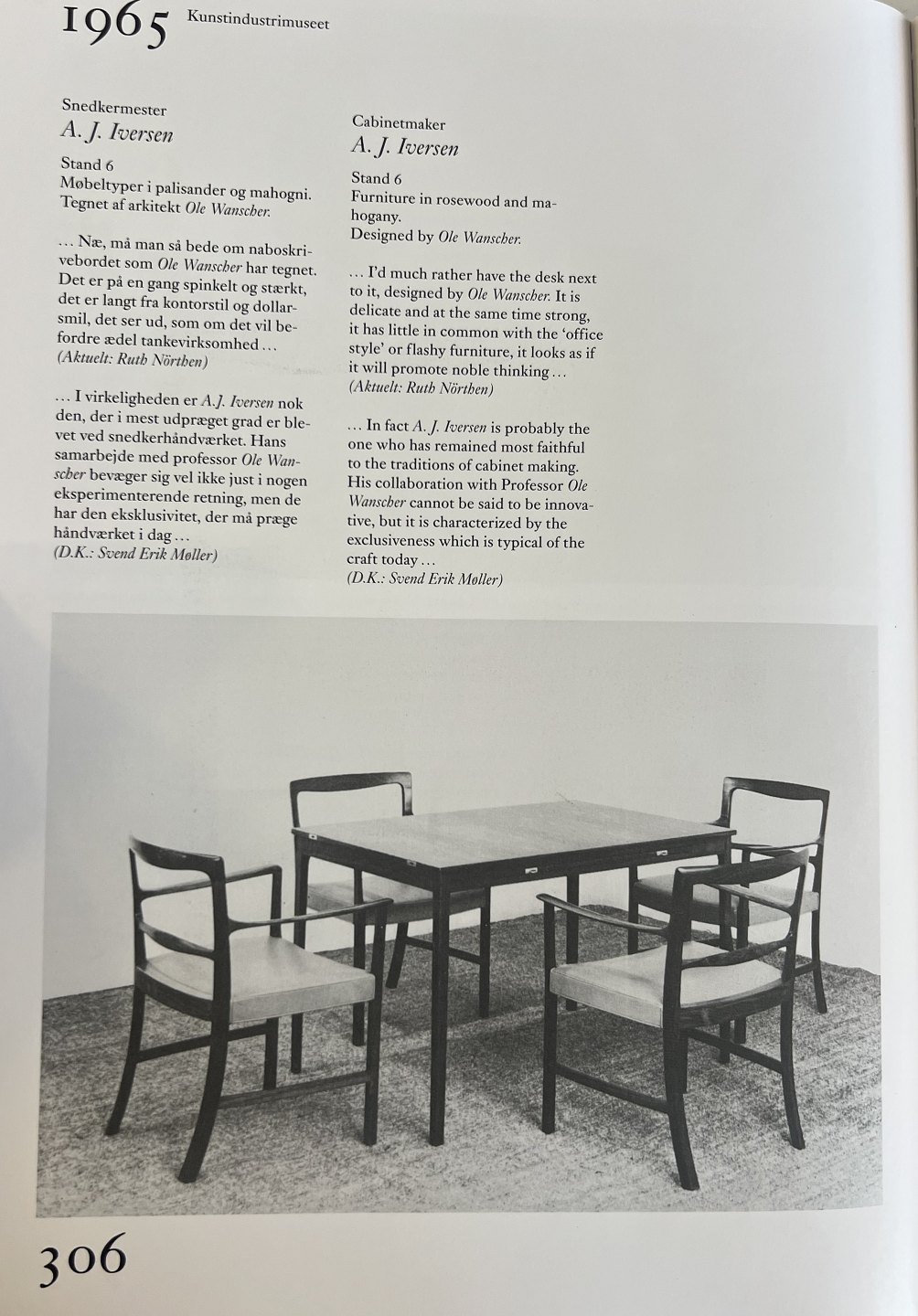 „…Darf ich dann um den Nachbarschreibtisch bitten, den Ole Wanscher entworfen hat. Er ist zugleich schlank und stark weit entfernt von Bürostil und Dollarsmil, und er sieht so aus, als würde er edle Gedankenarbeit fördern.“