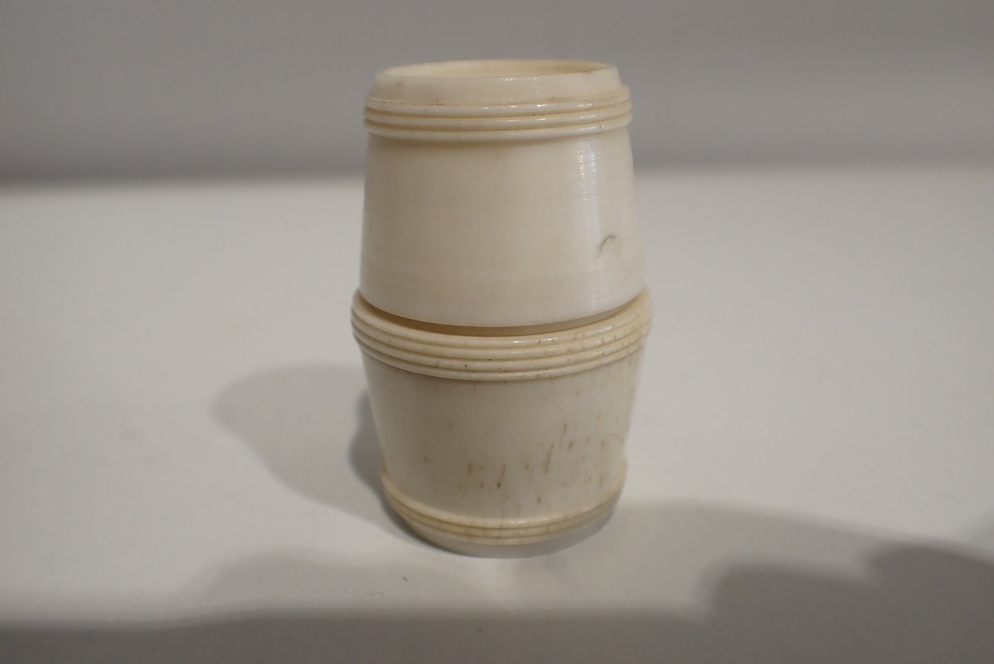 Lille tønde af ben med 25 miniature Domino brikker også i ben. Formentlig fra østen sidst i 1800-tallet. Højde 3,9 cm. Brikkerne er primitivt lavet og der er en revne i den ene tøndedel.