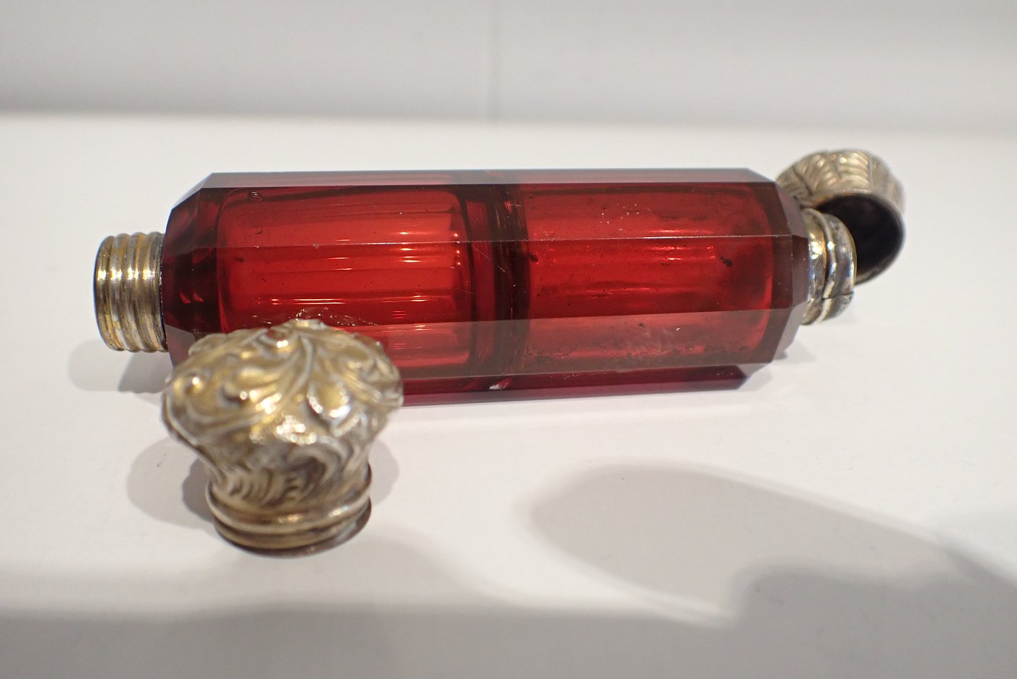 Engelsk dobbelt parfumeflaske fra 1800-tallet i rubinrødt glas med messinglukker. Lukke i den ene side er et vippelåg og der er et skrulåg med kork i den anden side. Begge låg er i messing med dekorationer. Længde med låg: 10,3 cm. - bredde: 2,5 cm. Flasken er i fin stand bortset fra at de mangler den lille glasstopper under vippelåget.