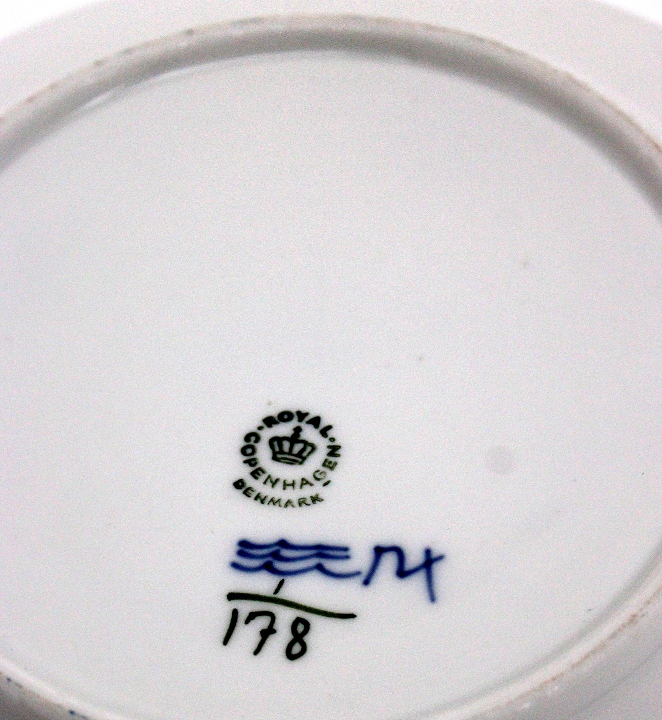 Text zugänglich auf Dänische: Royal Copenhagen, Musselmalet frokosttallerken. Nr. 1/178. Diameter 21 cm. I. sortering, men med brun brændingsplet se ekstrafoto med hvid baggrund. Foto med sort baggrund er modelfoto. Pris: 375 kr. stk. Lager: 1