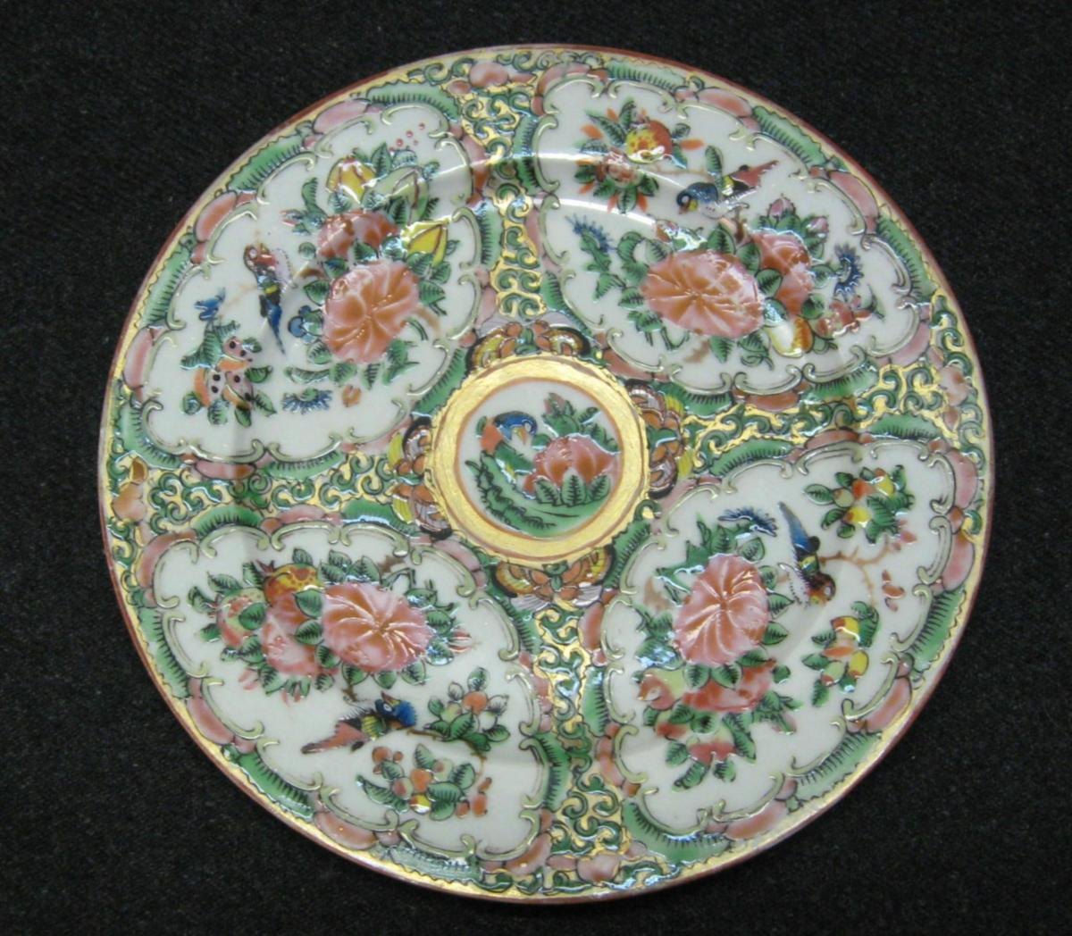 Canton Rose Platte, 19. Jahrhundert. Figurenszenen mit Rosen und Vögeln. Polychromie und Vergoldung. Dia:. 24 cm. Fehlerfrei.