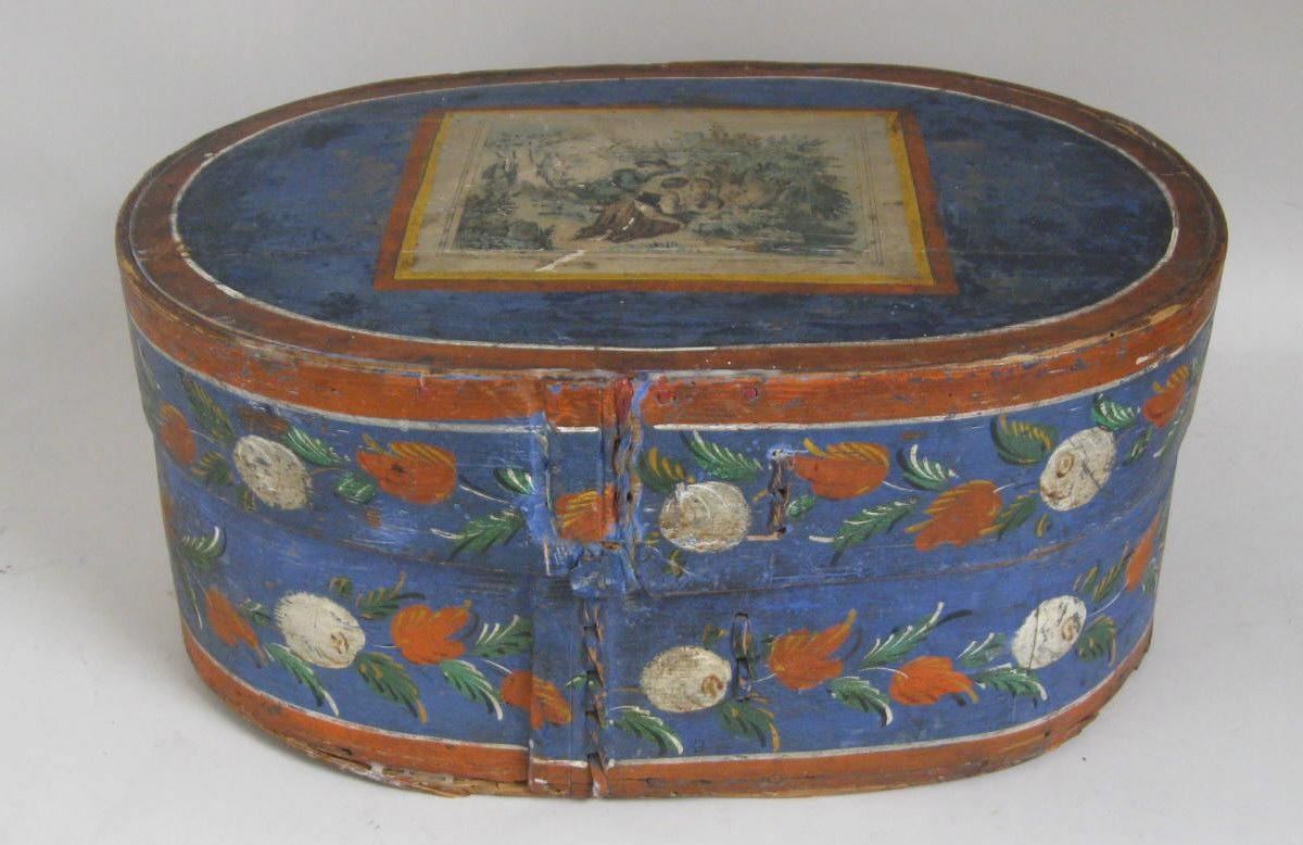 Perücke Box, Deutschland, 19. Jahrhundert. Blau, rot und weiß gemalt mit Rosenmuster. Auf dem Deckel ein handgemaltes Lithographie. L:. 47 cm.Reparaturen.