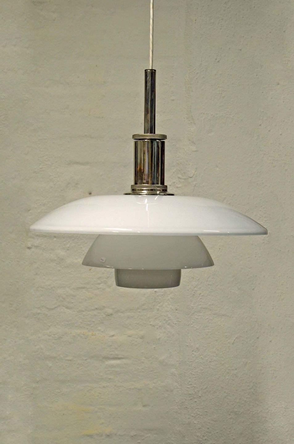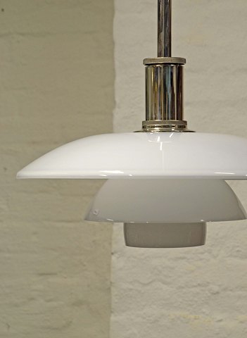Text zugänglich auf Dänische: PH glaspendel model 4½-4 designet af Poul Henningsen med skærm af mundblæst hvid opalglas og fatningshus af højglans forkromet aluminium. Der kan anvendes lyspære på max 150 watt.