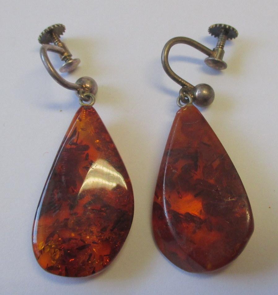 Paare Ohrschrauben mit polierten Bernstein mit Samenkapseln, 1900, Dänemark. L:. 3,6 cm. Gewicht: 5,8 cm.