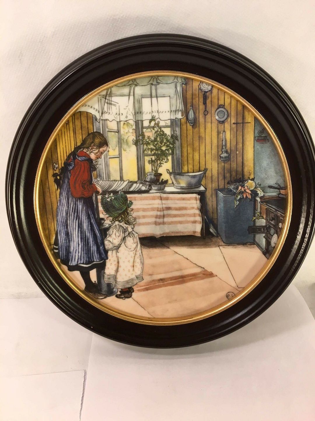 Royal. Teller mit Motiv von Carl Larsson. Made in 9500 Kopien Rahmen aus schwarz lackiertem Holz. Ø 26 cm.