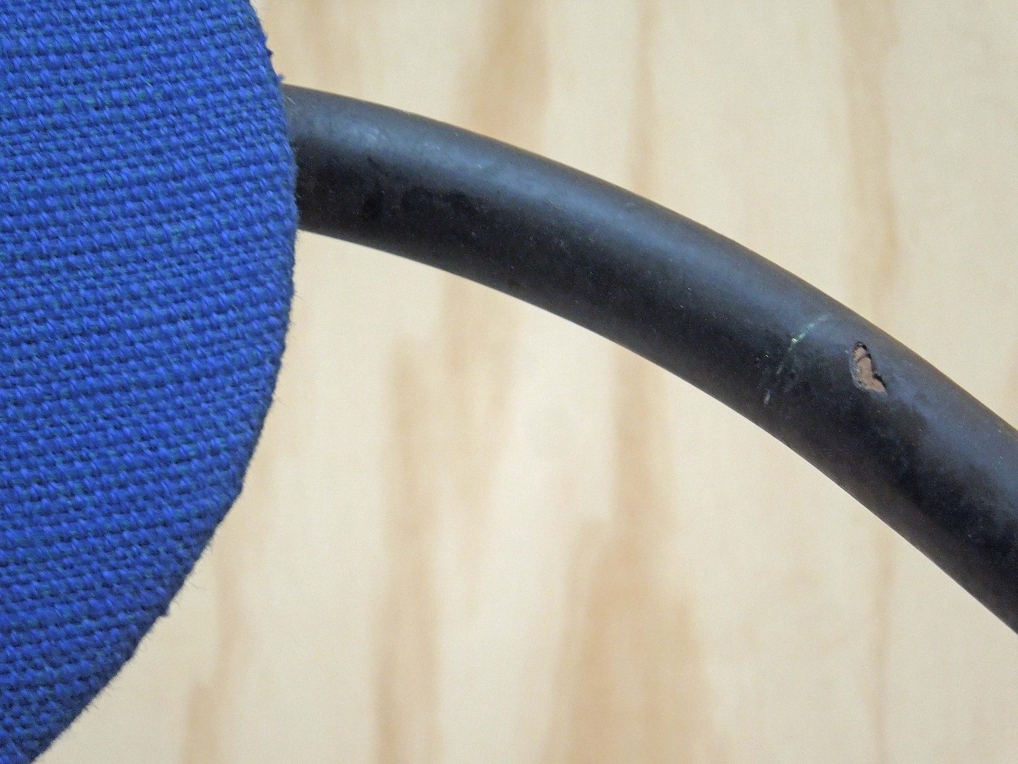 Biografstol med sort metal stel og blå betræk. Skader på polstring.