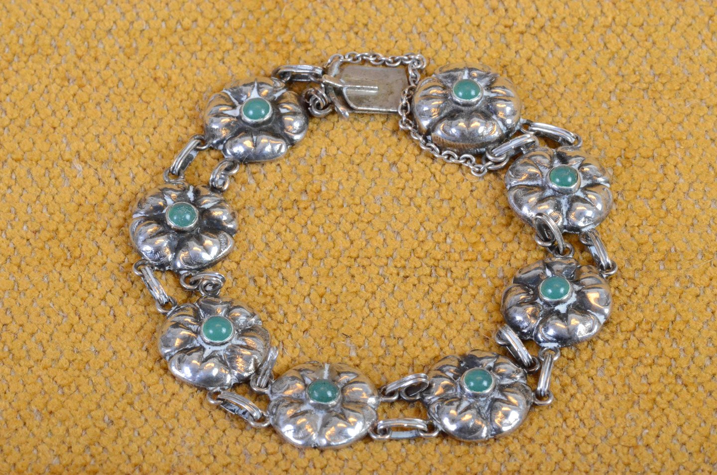 Armbånd skønvirke i sølv med lukket bagside. Blomster af sølv med center i grøn agat. Str.: 21 cm. Art No. 41