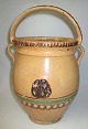 Sorring Mutterschaft Topf, ca. 1860 - 1870. Sorring in der Nähe von Silkeborg, Dänemark. Mit warmen gelben Slip. Dekoriert mit Cirklen und Linien in grün und braun. Mit kastanienbraunen Reliefs der Mutter und des jungen Mädchens. Befestigt an der Innenseite. Höhe mit Griff: 31 cm.