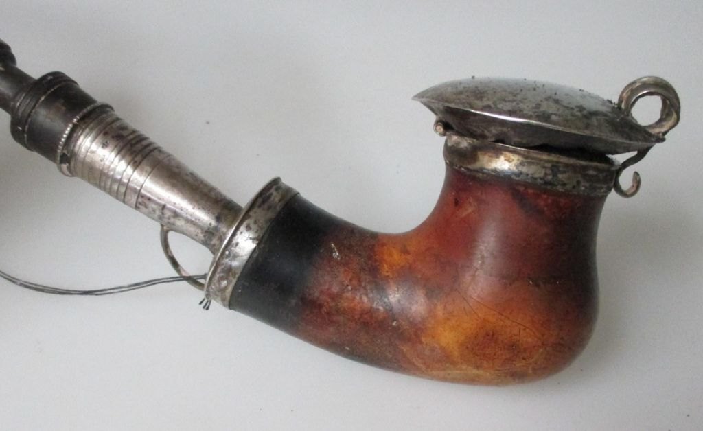 Dansk merskums pibe, 19. årh. Længde.: 54 cm. Med sølv låg og beslag med dekorationer, stempel for Ernst Christian Næss (ca. 1778 - 1855), sølvsmed i Næstved.